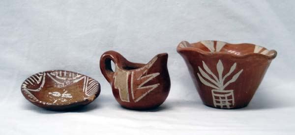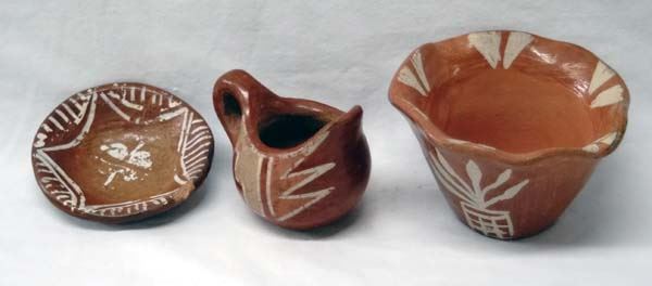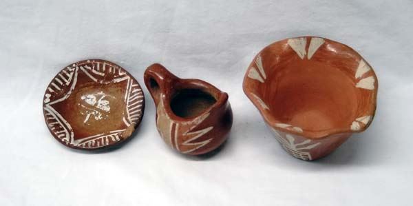 3 Vintage Native American San Juan Pueblo Pottery Jars, largest measures 3'' x 4'', includes small polychrome pitcher, fluted rim bowl, and small shallow bowl which has a chip in the rim, nice thick walled pottery