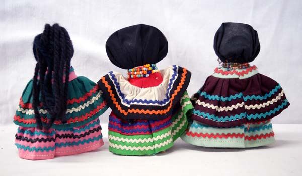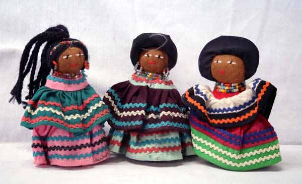 3 Native American Seminole Cloth Dolls, largest measures 4.5''H x 3.5''W, traditional dress, embellished with beads