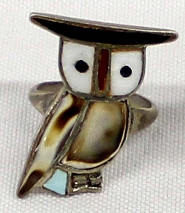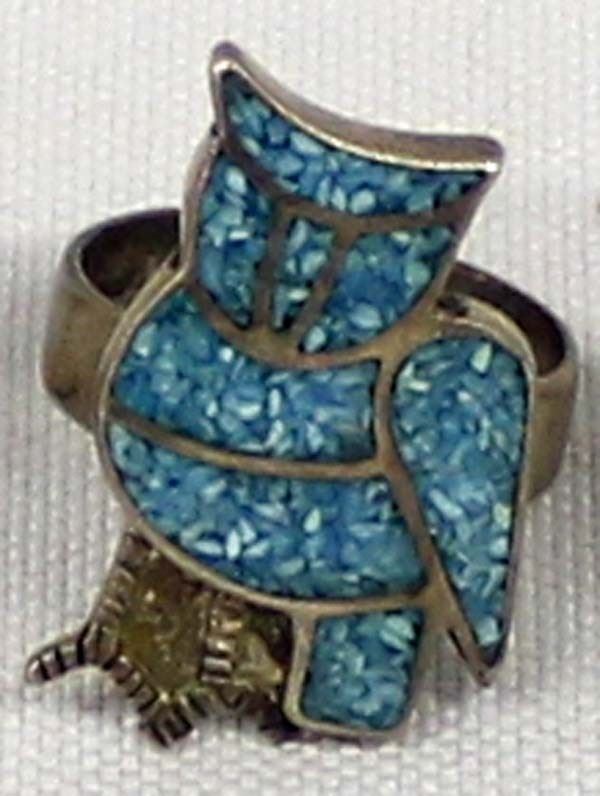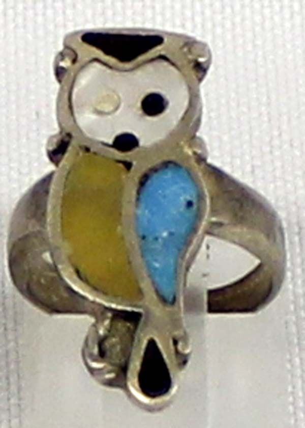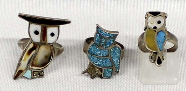 3 Native American Sterling Silver Owl Rings, largest is a size 7.5, includes Zuni Inlay, Navajo Chip Inlay Turquoise, and Navajo Inlay (missing eye), longest measures 1.25''L