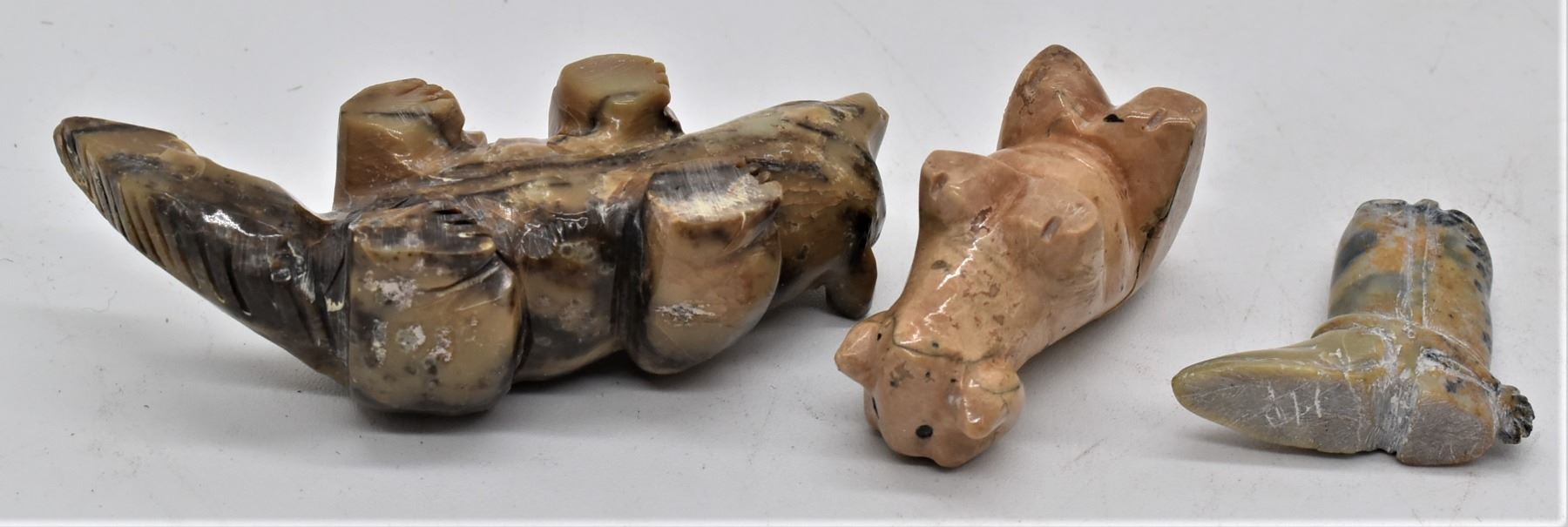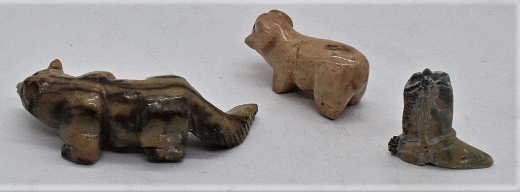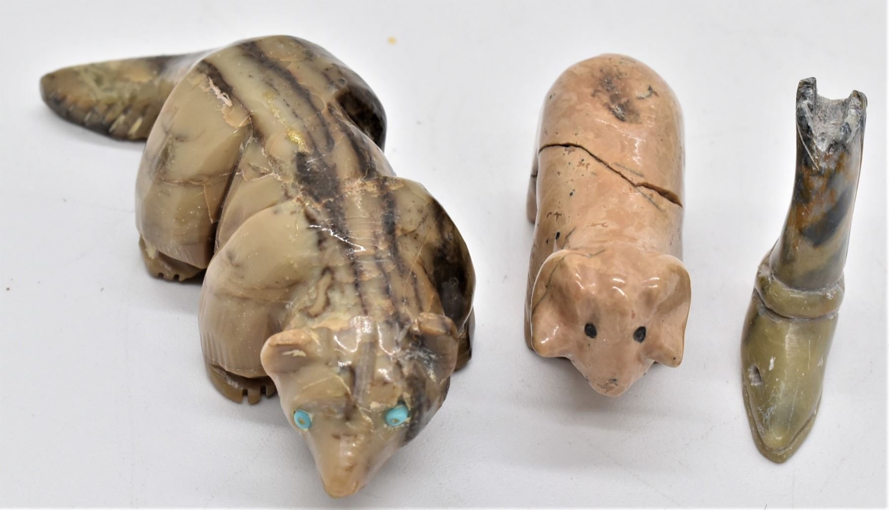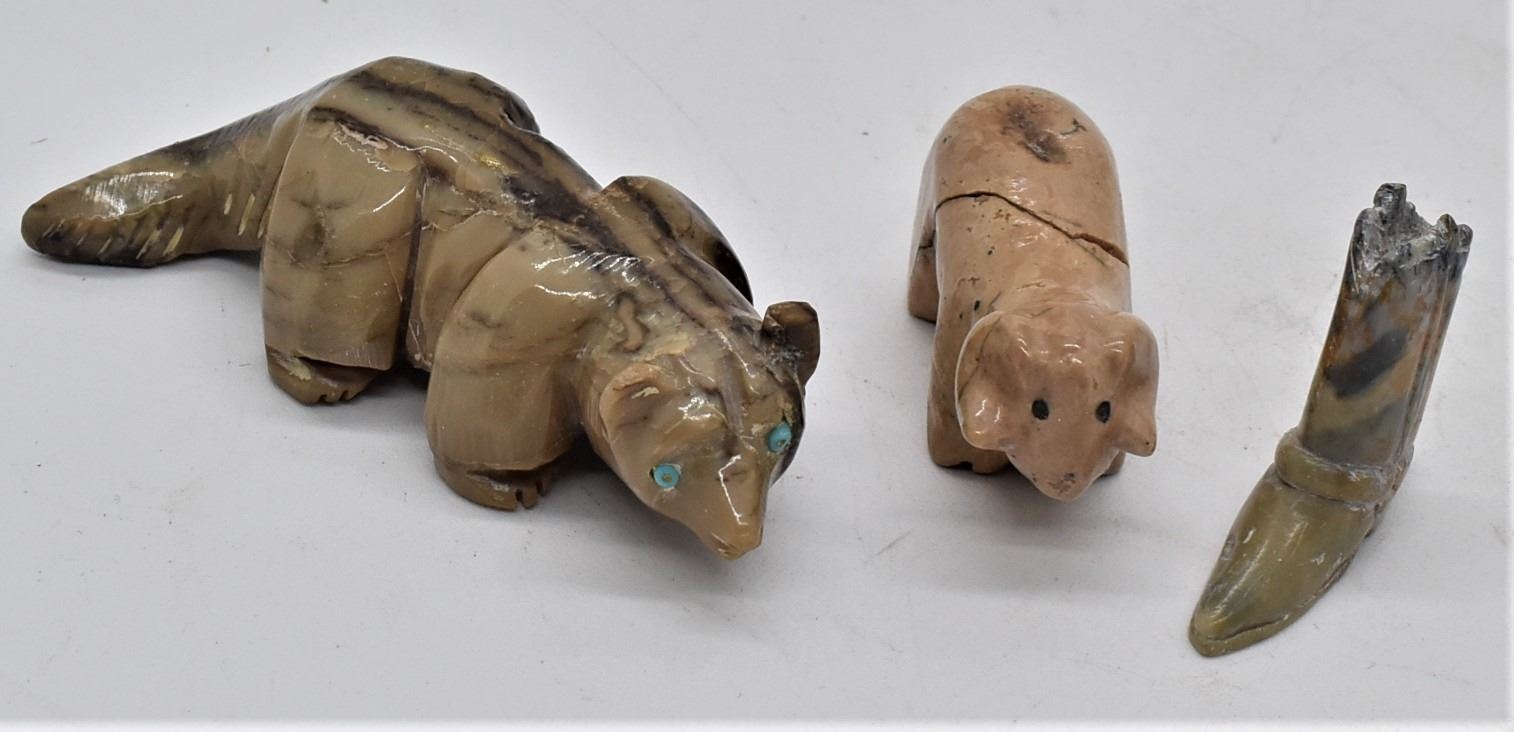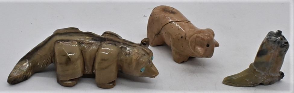 3 Native American Stone Animal Fetishes, includes 1. Zuni Picasso Marble Boot Fetish, marked on the bottom 2. Navajo Dolomite Ram Fetish, has been glued 3. Zuni Picasso Marble Badger Fetish, turquoise eyes, longest measuring 3.25''L x 1.25''W x 1''H