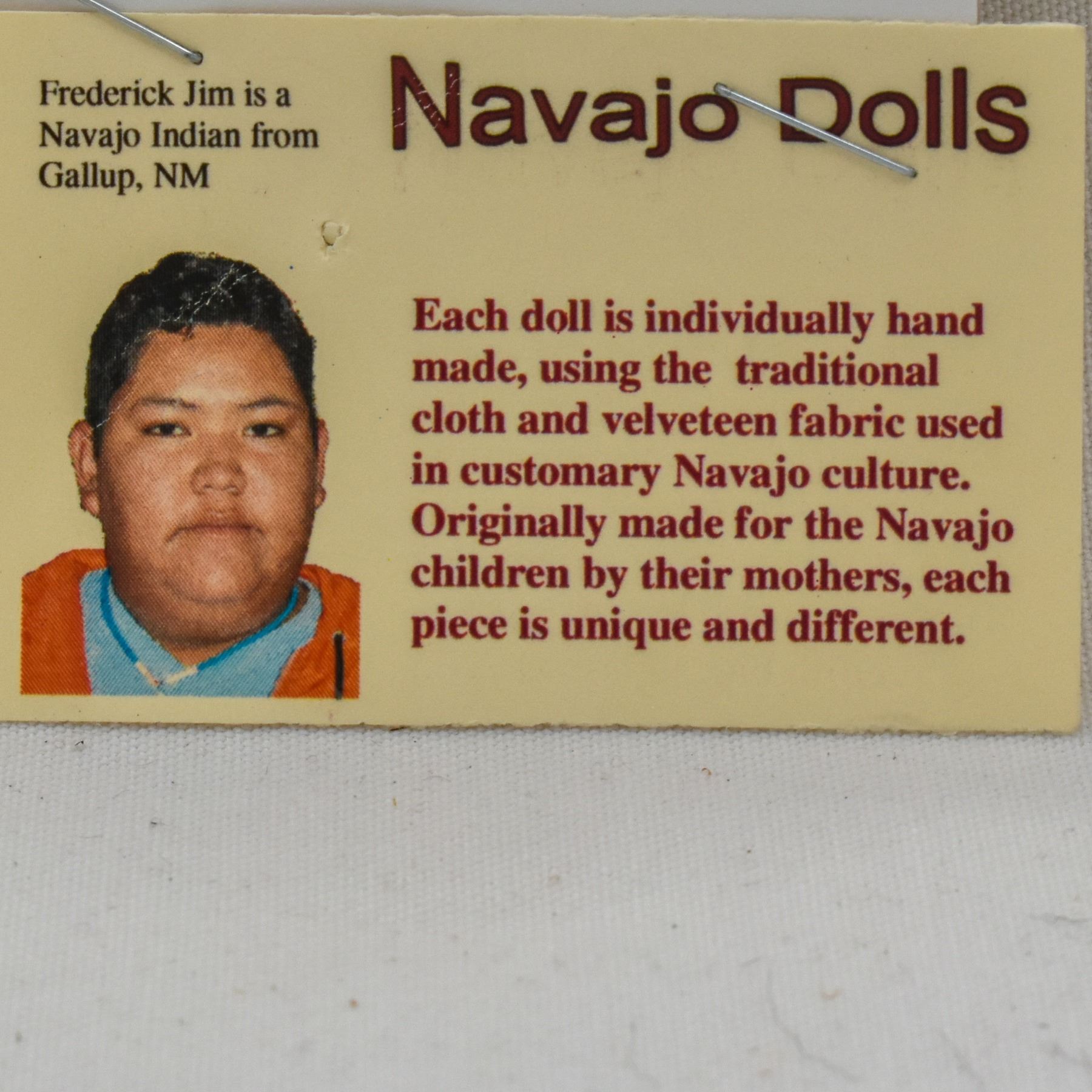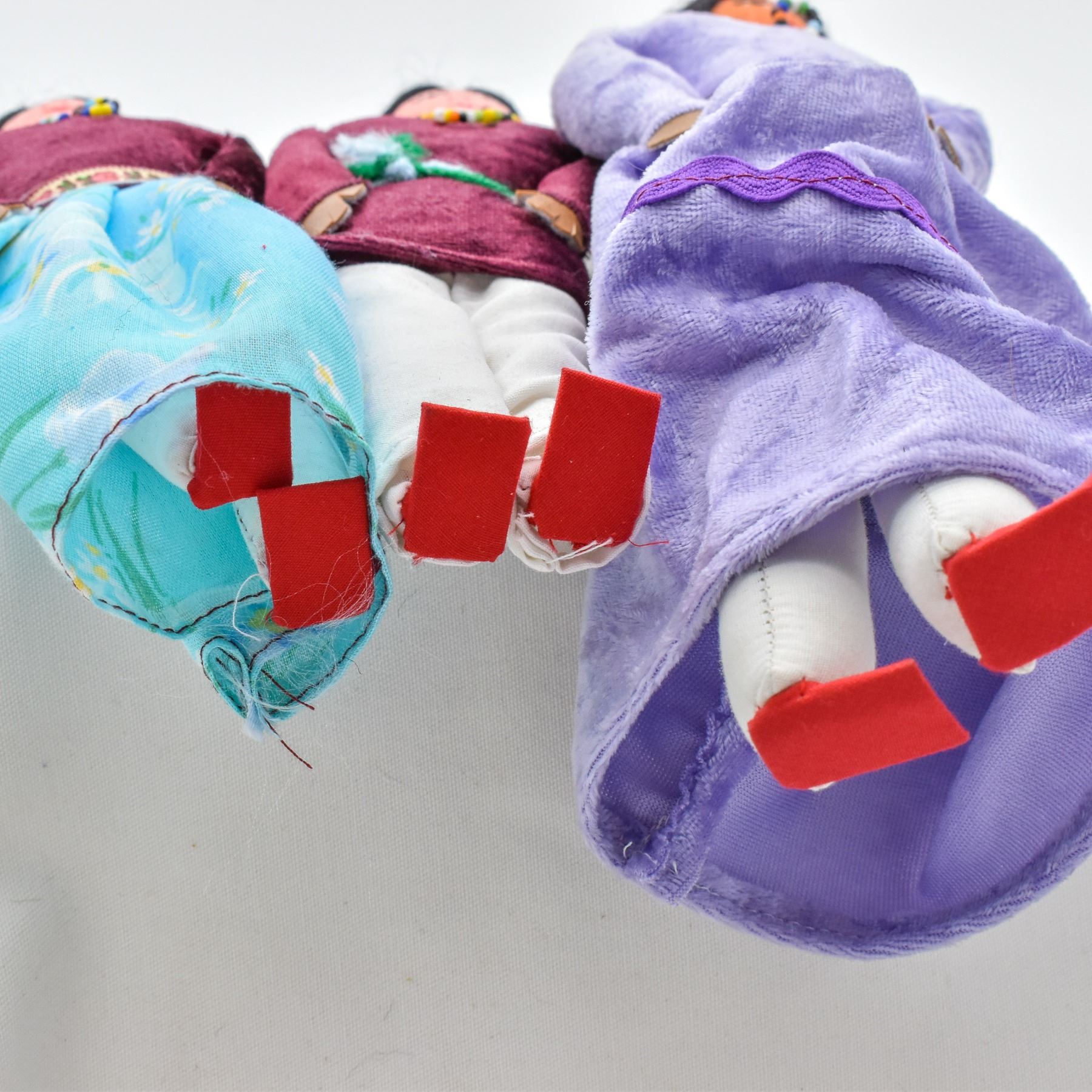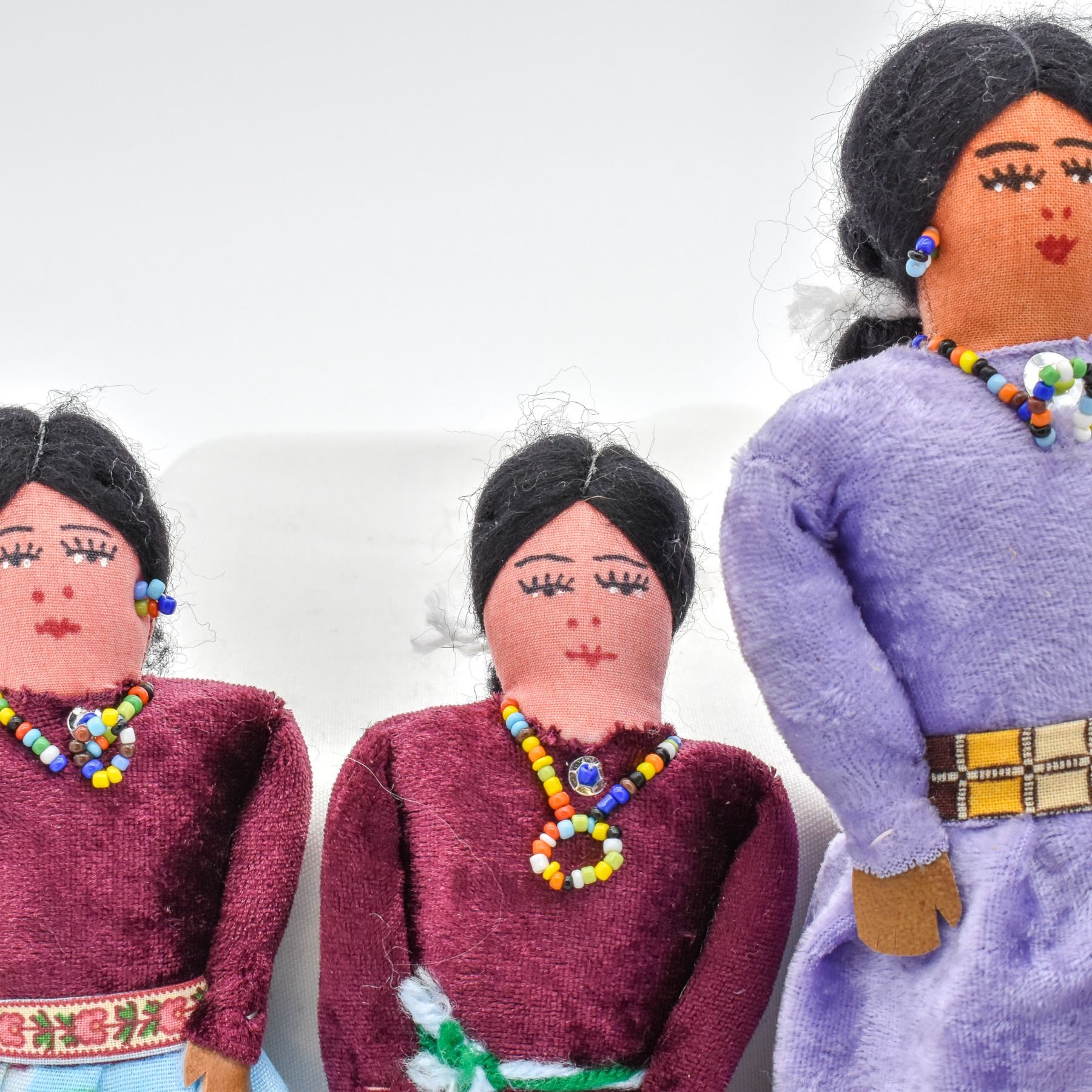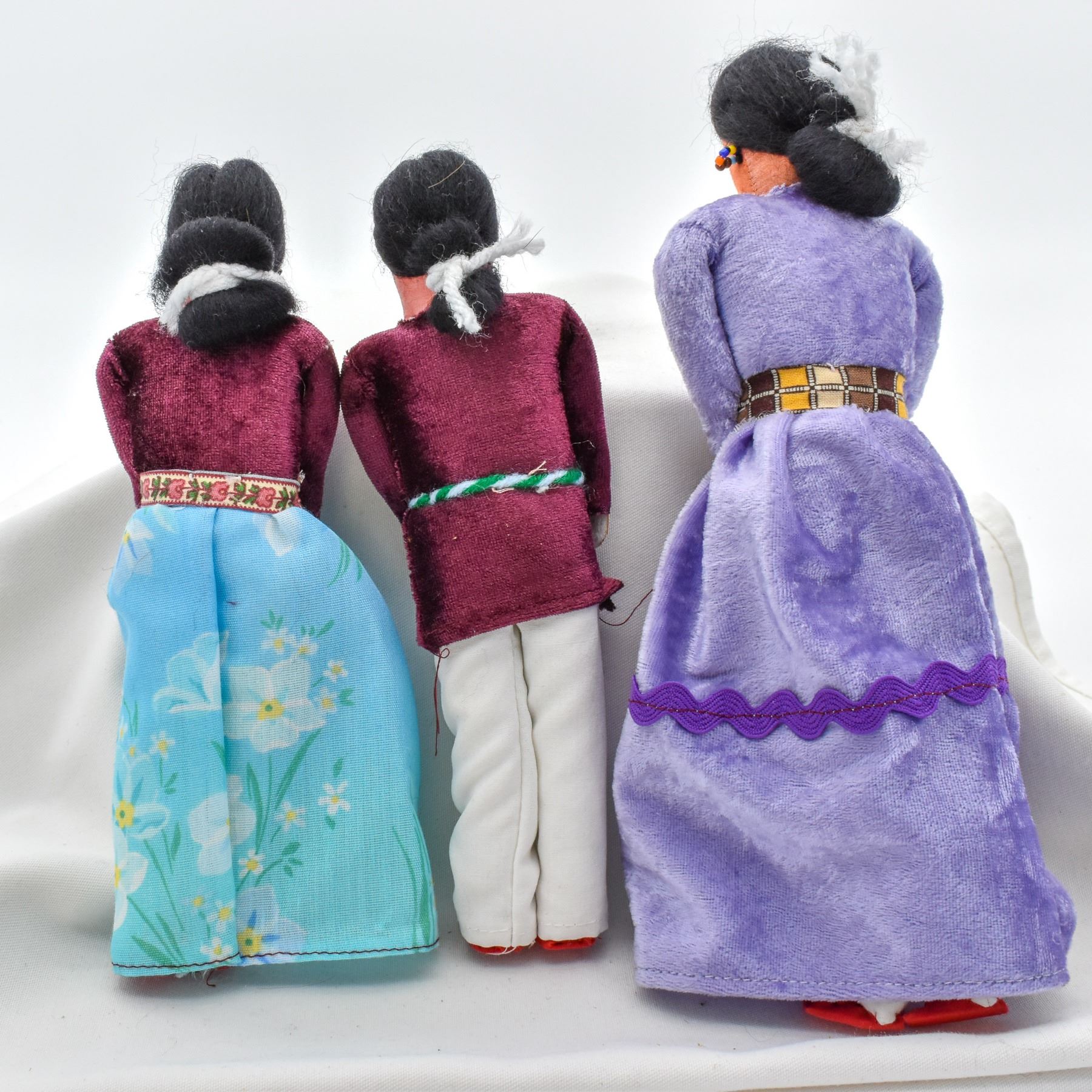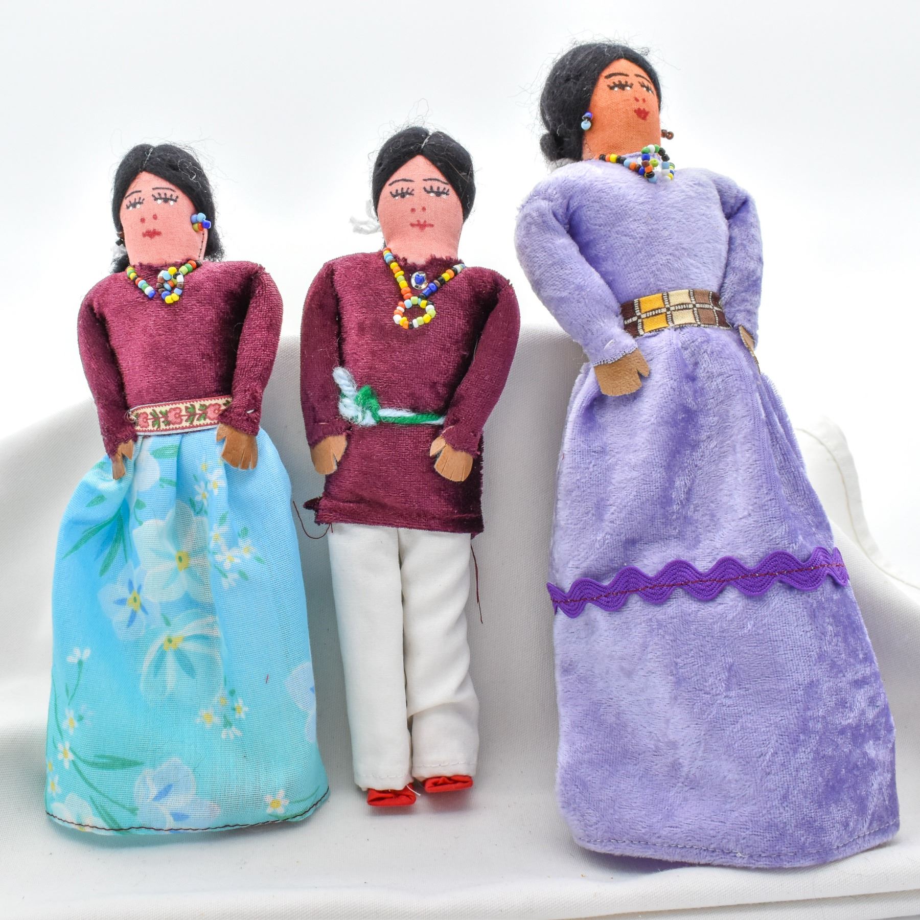 3 Traditional Native American Navajo Cloth Dolls by Frederick Jim, largest measures 8.5"L x 5"W, hand drawn faces, each wearing traditional Navajo women's tops and skirts, all are wearing bead jewelry