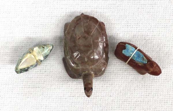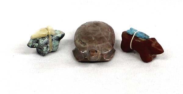 3 Native American Zuni Carved Stone Fetishes, includes sea turtle with jet eyes (largest measuring 1'' x 1.5'', neck has been glued), and 2 bears (soapstone and turquoise)