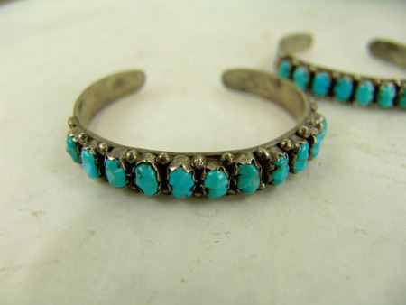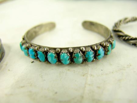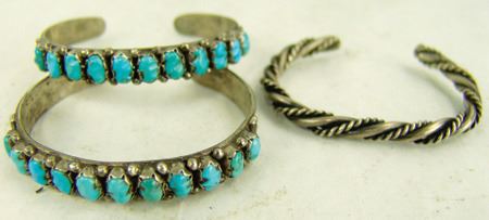 Ca. 1950s-1970s, Collection of three all-silver bracelets, one twist design, the others each with 11 soft faceted turquoise nugget stones. very good condition. 5" + 1" gap