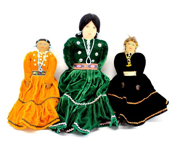3 Navajo Dolls. Three cloth dolls with beaded jewelry and trim. The largest is 12''Hx9''W.