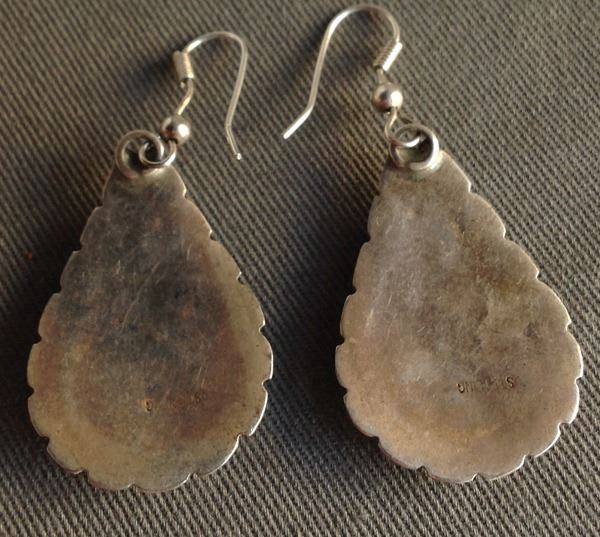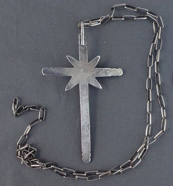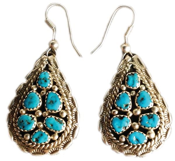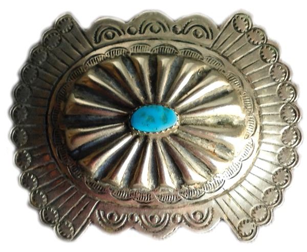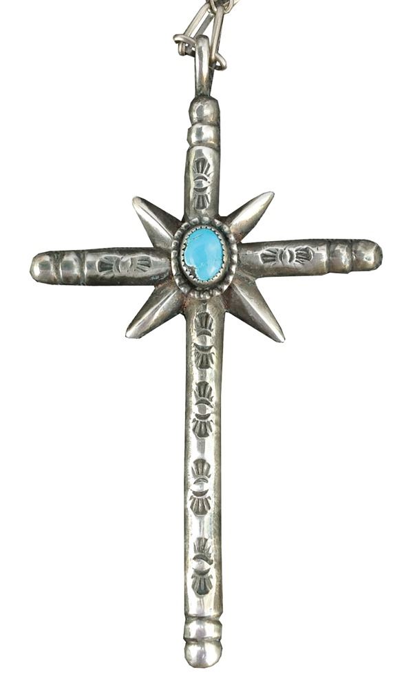 Mid/Late 1900s 4" x 2-1/2" cross Includes a vintage sand cast cross pendant necklace, larger teardrop earrings with 6 stones each, and a ladies size buckle, all turquoise and silver. Very good condition.