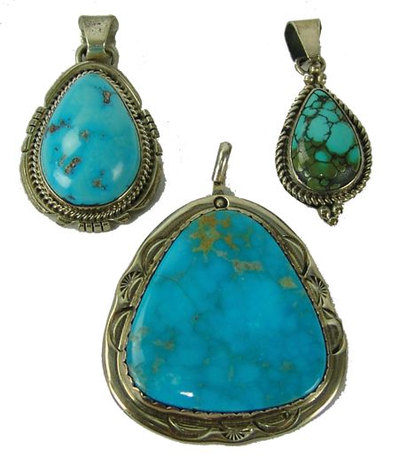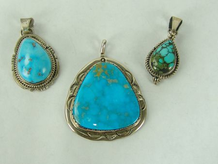 Ca. 1970s-1980s, All turquoise and silver done in traditional style, the largest by Clyde Begay, the smallest by Sherry Sandoval, the other signed by "RB." All in very good condition. 1-1/2" x 1/2" to 2" x 1-1/2"