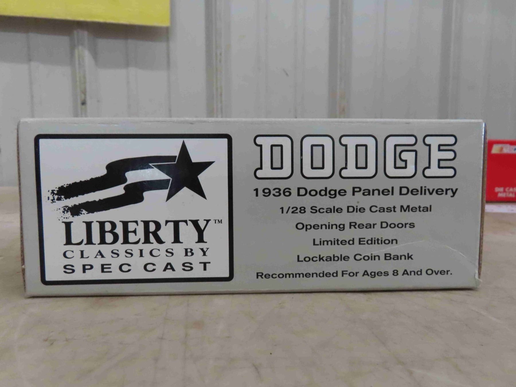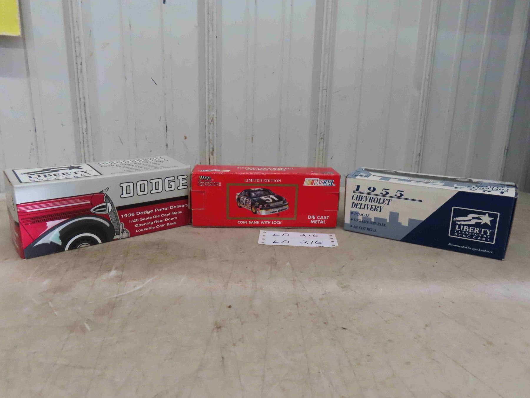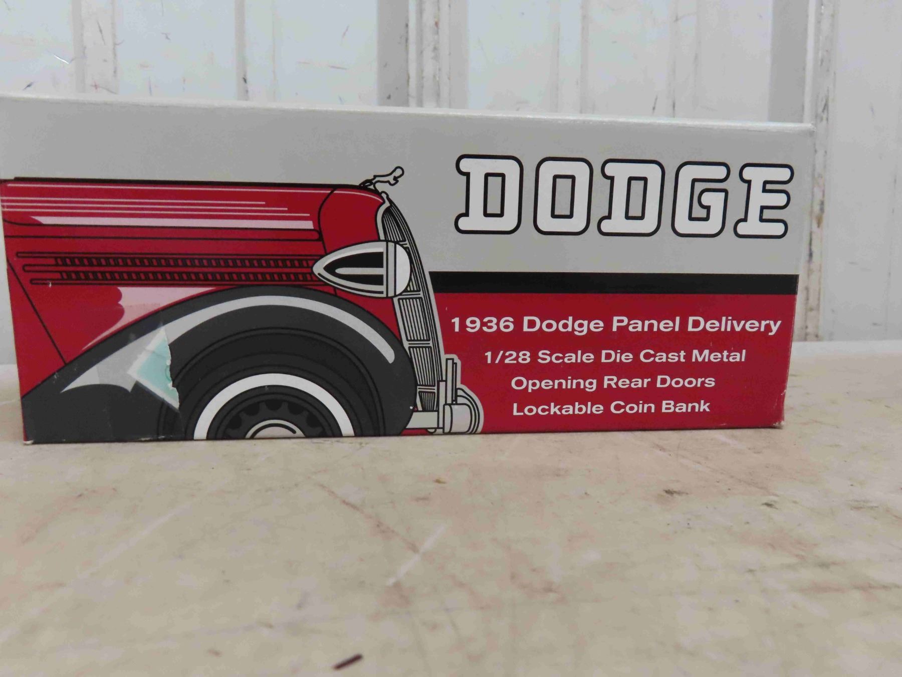 3 New Diecast Metal Lockable Coin Banks : 1936 Dodge Panel Scale 1:28 , 1955 Chevy Delivery Scale 1:25, 1 Other