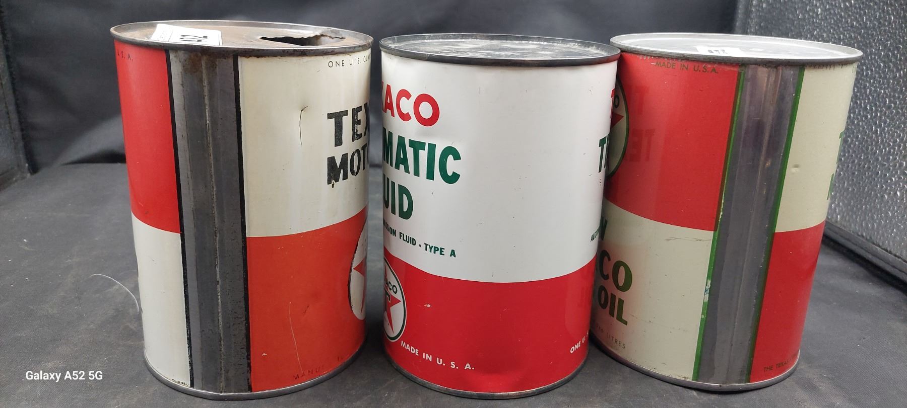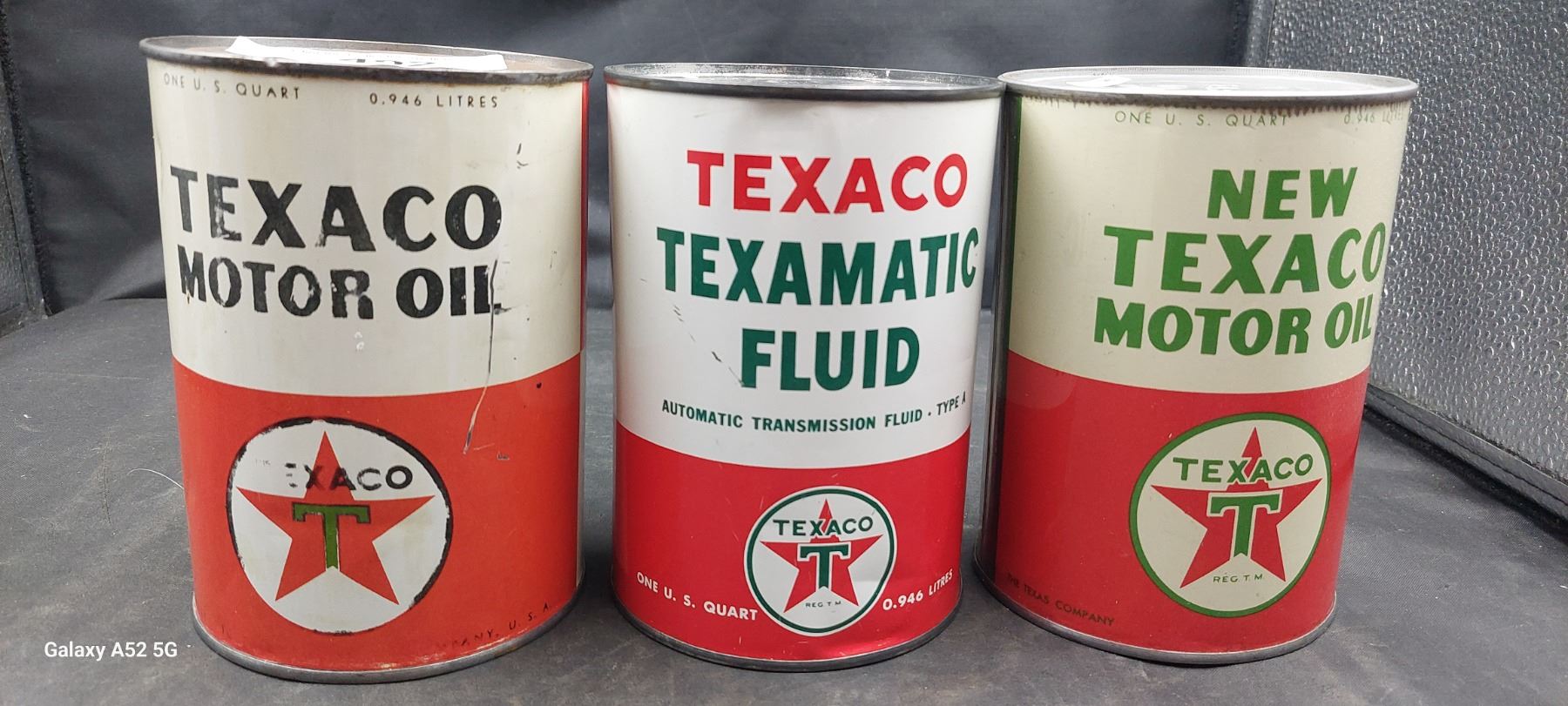 3 Nice condition vintage Texaco motor oil and ATF U.S. quarts, 1 full 2 empty