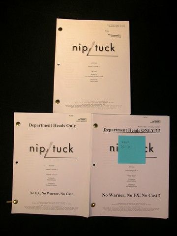 Three scripts from the hit series "Nip/Tuck season 3 including, episode #9 "Hannah Tedesco," episode #11 "Abby Reese" and episode #12 "Sal Perri".