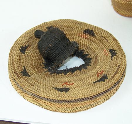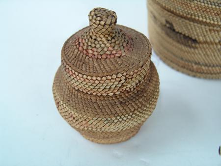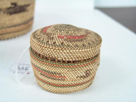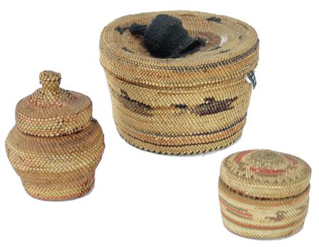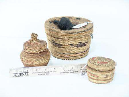 Circa Early/Mid 1900s, Collection of three traditional lidded Makah treasure baskets, the largest with a bird head handle (which is dis-attached) otherwise all very good condition. Ex: Frank Curley collection. 5" x 4", 2-1/2" x 3-1/4", 6" x 6"