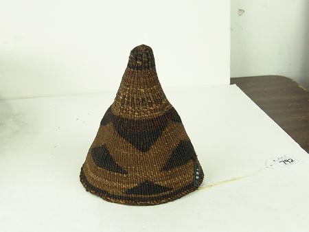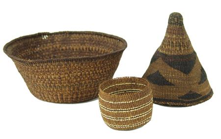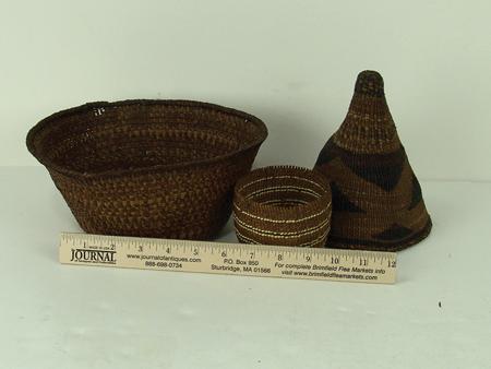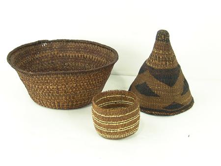 Circa Early 1900s, A flared Salish plaited cedar root bowl, a miniature Chilkat conical burden basket and a small Hupa or Yurok bowl. All in very good condition. 4" x 9", 3" x 3-1/2", 7" x 6"