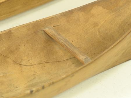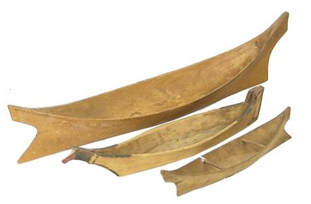 Circa Early/Mid 1900s, Set of three hand carved traditional wooden canoes, vintage era, all in very good condition. 24" x 6" largest From the Johnson Collection.