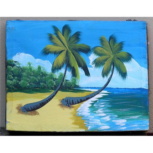 A set of three small stretched original paintings on cloth of coconut palms on the beach. The largest one shows the ocean waves coming ashore, with clouds and a deep blue sky in the distance. A row of small trees lines the beach fairly close to the shore. This largest of the three paintings is apparently unsigned, and may be the work of a different artist than the pair of smaller ones. Each of the smaller paintings is signed at lower left by the artist, 'Mendoza '93'. Each shows coconut palms with flower groupings around their bases, with birds and a small sailing ship and sand bar in the distance. One seems to be a daytime scene, the other a nighttime scene with the full moon in the sky reflecting off the water. <p>