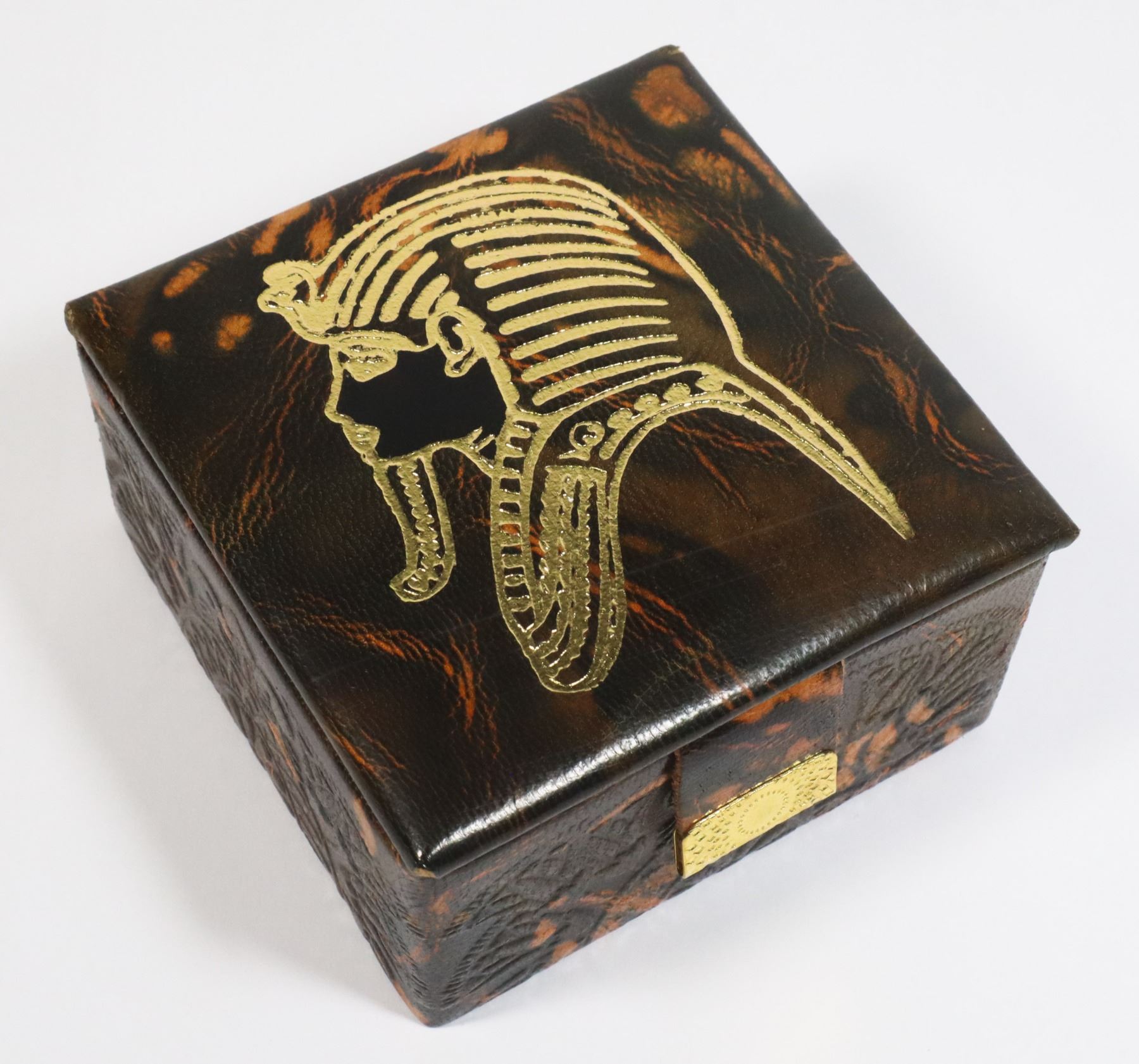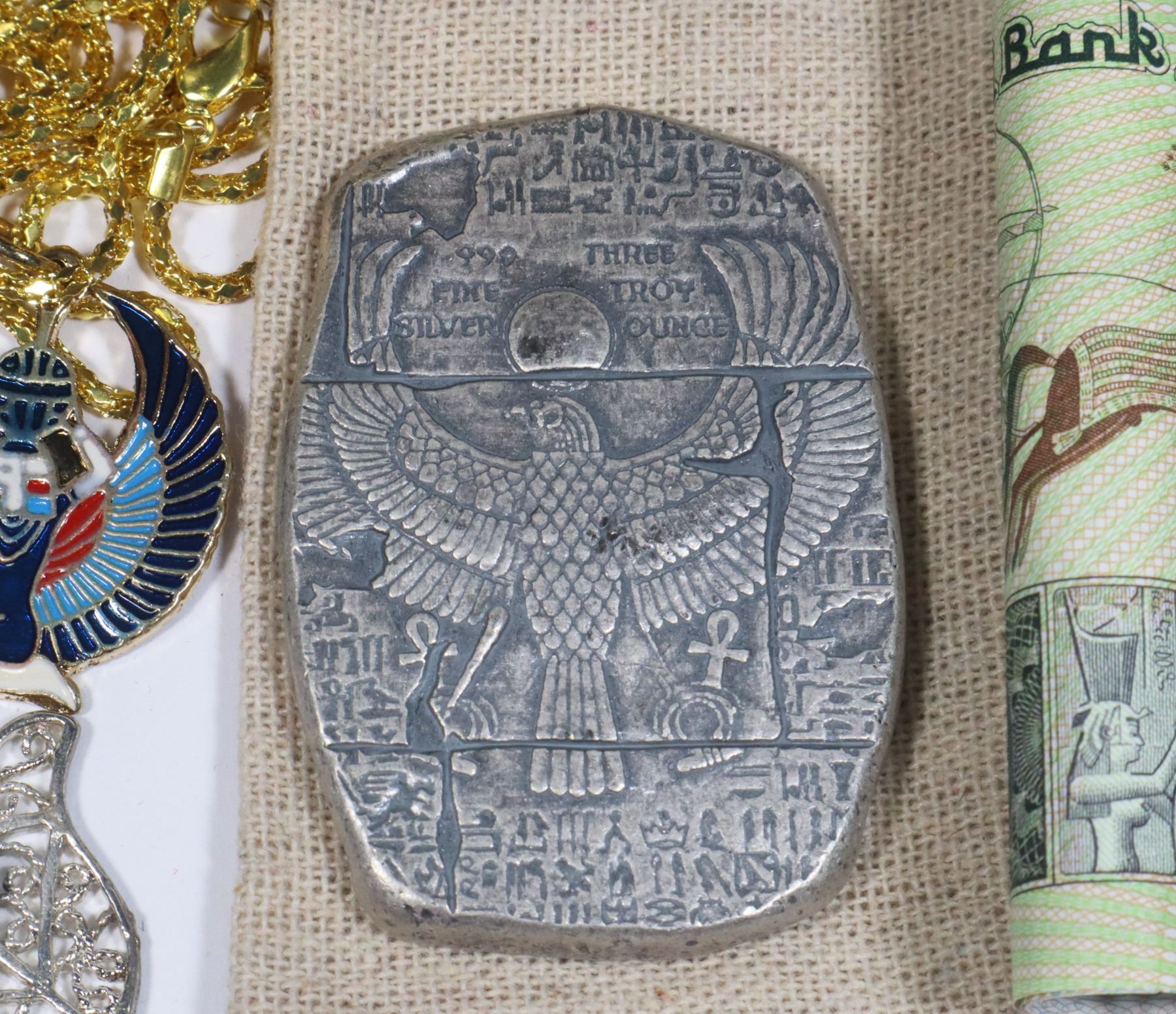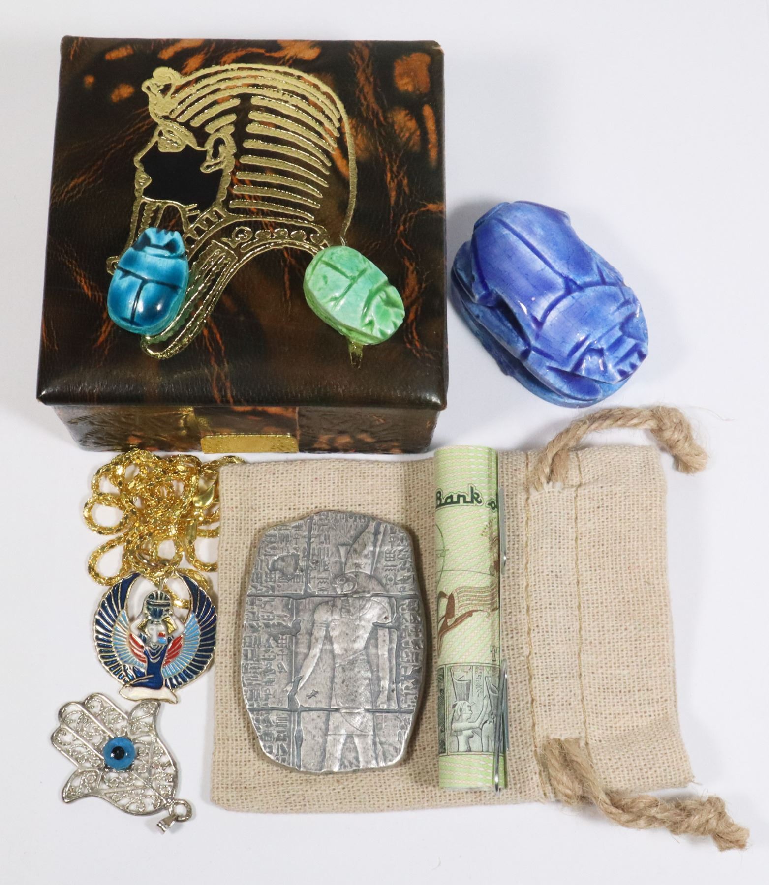 COMES WITH EASEL, HEMP DRAWSTRING BAG, BEAUTIFUL JEWELRY BOX, ONE LARGE AND TWO SMALL HAND CARVED LUCK SCARABS, 2PC OF JEWELRY, GRAPHIC BANK NOTE. ALL MADE IN EGYPT***ITEM(S) LOCATED IN LETHBRIDGE ALBERTA. ALL ITEMS IN THIS AUCTION QUALIFY FOR OUR FREE TRANSPORT TO EDMONTON SERVICE. WORLDWIDE SHIPPING AVAILABLE