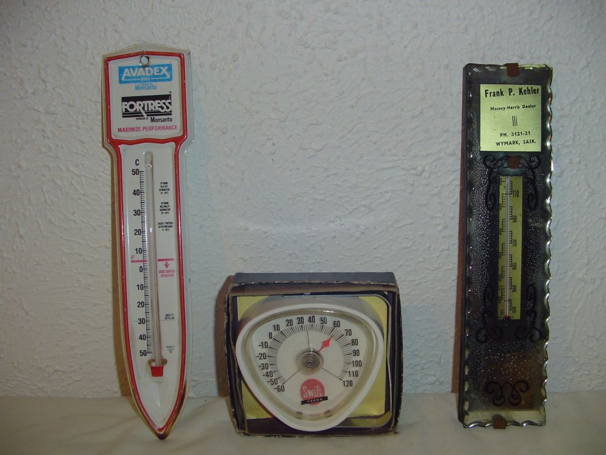3 Old Advertising Thermometers - Massy Harris, Avedex, and Swift Feeds