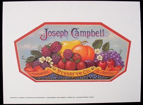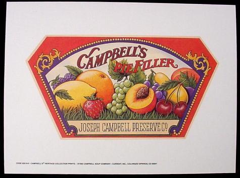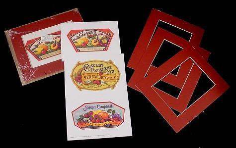 This bright and fresh trio of three Campbell Soup Company Heritage Prints (© 1992) featuring old fashioned Campbell jelly, preserve and pie-filler labels, comes complete with three ready-cut mats. This mini-collection is new old stock, shrink-wrapped and with the original stickers. Each of the three prints measures 5¾ × 7¾. The mats are 8 × 10.