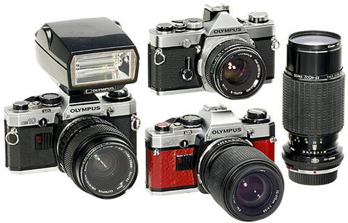 3 Kameras Olympus SLR Olympus, Japan. 1) "OM-1", erste Version ohne Motorkupplung, mit Zuiko 1,8/50 mm, Sucher verschmutzt. (3/4) - Und: 2) 2 x "OM 10", 1 x rote Belederung, mit Zuiko 3,5/35-70 mm und Tamron 4-5,6/70-210 mm. - Sowie: 3) Olympus "Quick Auto 310" und "Sigma 4,5/70-210 mm" (Blende hängt). - Kameras nicht getestet.