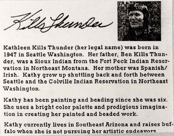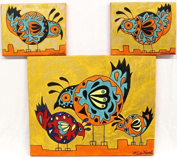 3 Original Acrylic Bird Paintings by Kills Thunder, includes: Two 8'' x 10'' and one 16'' x 20'', all 3 are signed, includes: Nokomis, Cholena, and Kewanee, Artist Bio: Kathleen Kills Thunder (her legal name) was born in 1947 in Seattle, WA. Her father, Ben Kills Thunder, was a Sioux Indian from the Fort Peck Indian Reservation in NE Montana. Her mother was Spanish/Irish. Kathy grew up shuttling back and forth between Seattle and the Colville Indian Reservation in NE Washington. Kathy has been painting and beading since she was six. She uses a bright color palette and prodigious imagination in creating her painted and beaded work. Kathy currently lives in SE Arizona and raises buffalo when she is not pursuing her artistic endeavors.