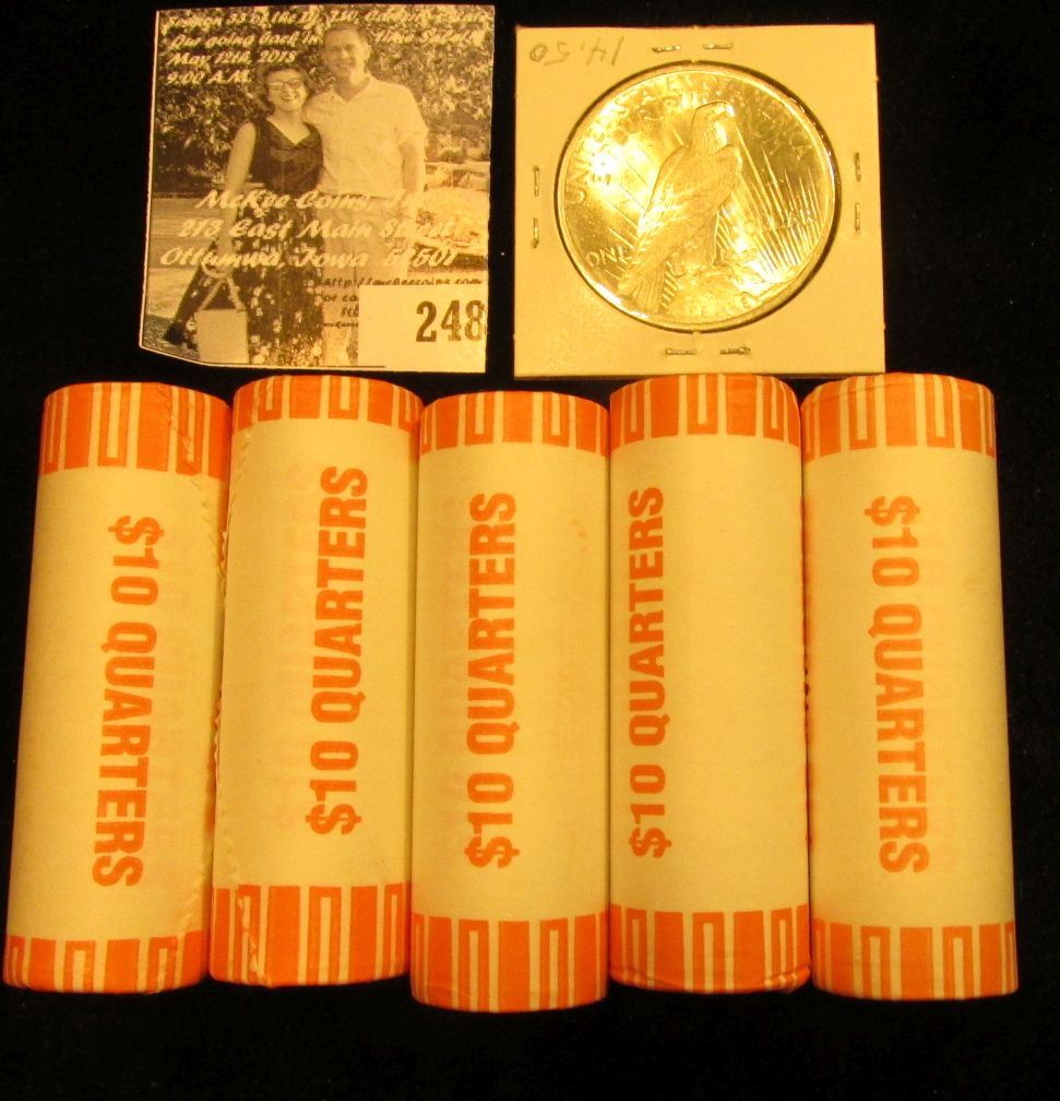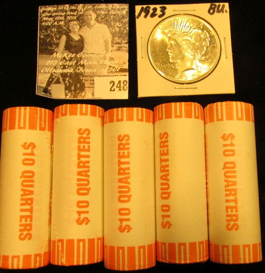 (3) Original BU Bank-wrapped Rolls of 2003 D Arkansas, 2002 D Mississippi, & 2003 D Illinois Statehood Commemorative Quarters; & 1923 P U.S. Peace Silver Dollar, Gem BU. (total face value $51.00).