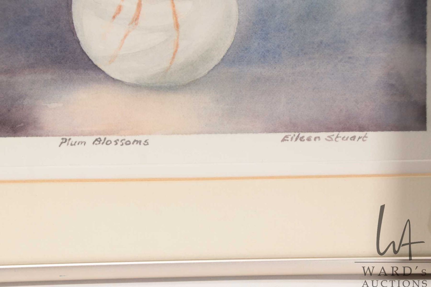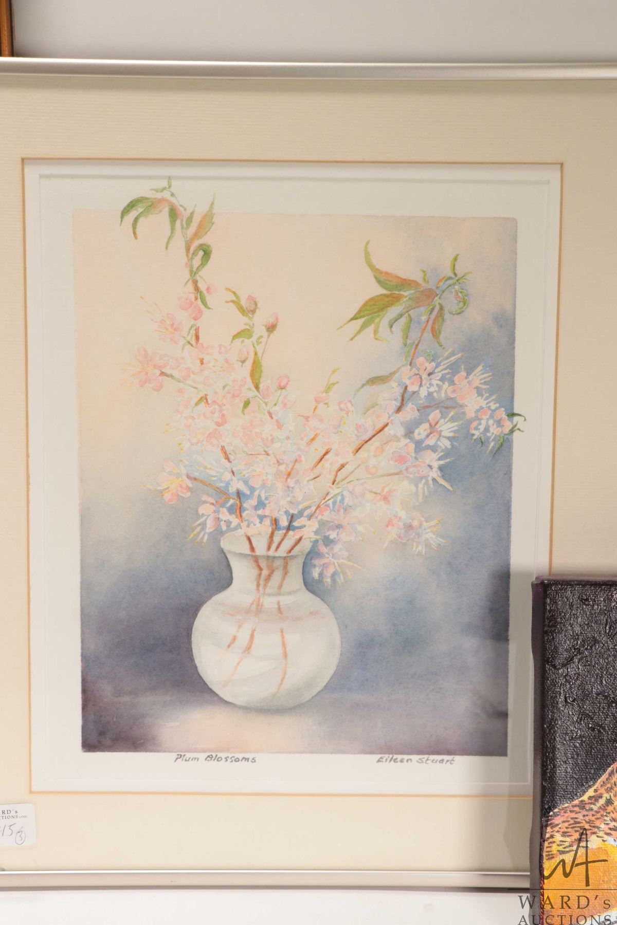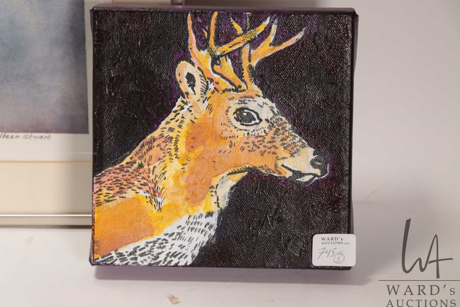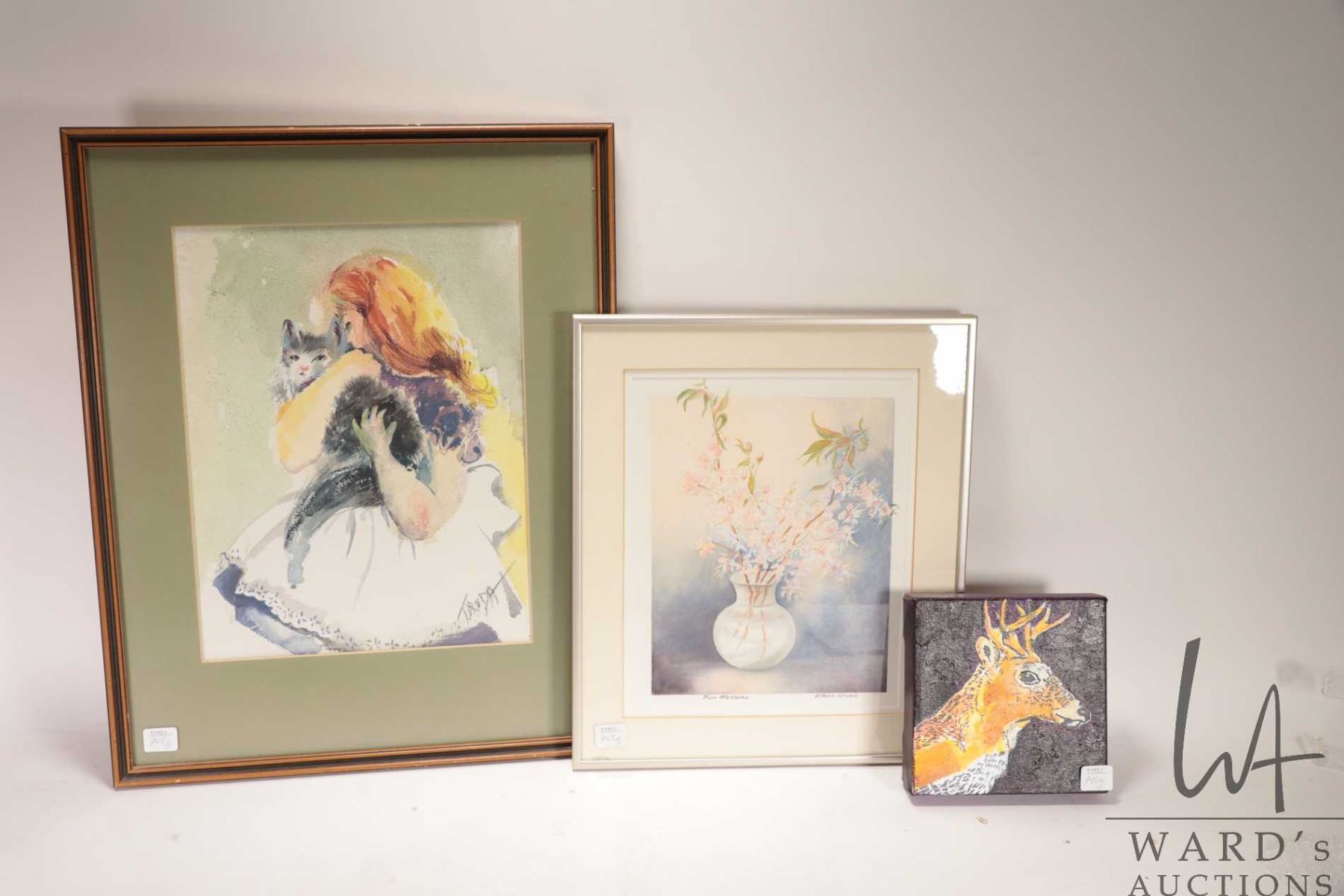 3 Original artworks including water color on paper of a girl and her cat, signed Truda, 13"x10". Watercolour on paper "Plum Blossoms", signed by artist Eileen Stewart, 10"x8", and a stretch framed "Baratheon Stag" signed by artist Alex Labarda, 6" x 6"