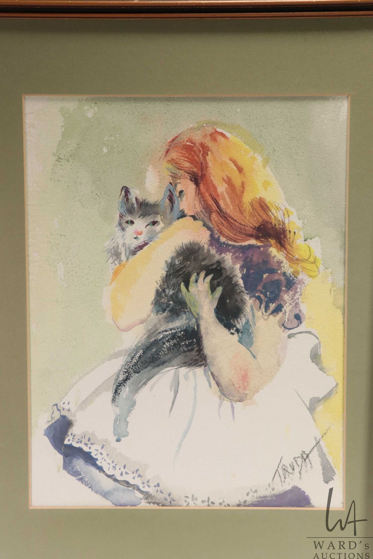 3 Original artworks including water color on paper of a girl and her cat, signed Truda, 13"x10". Wat