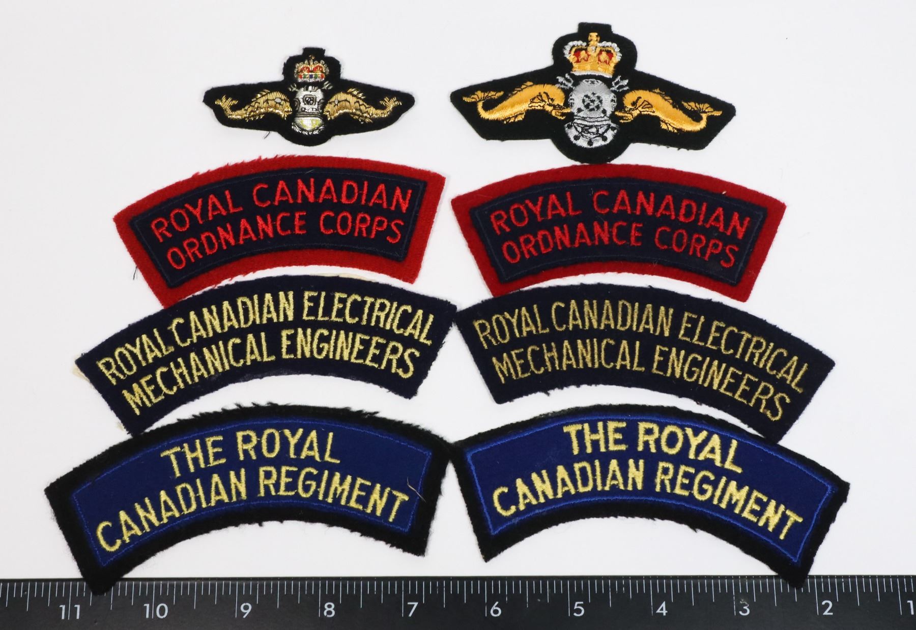 RCEME ROYAL CANADIAN REGIMENT COLD WAR ERA BATTLEDRESS INSIGNIA CLOTH LOT AND ROYAL CANADIAN NAVY DIVER BADGE PATCH LOT ROYAL CANADIAN DIFFERENT STYLE/SIZE CLEARANCE DIVER