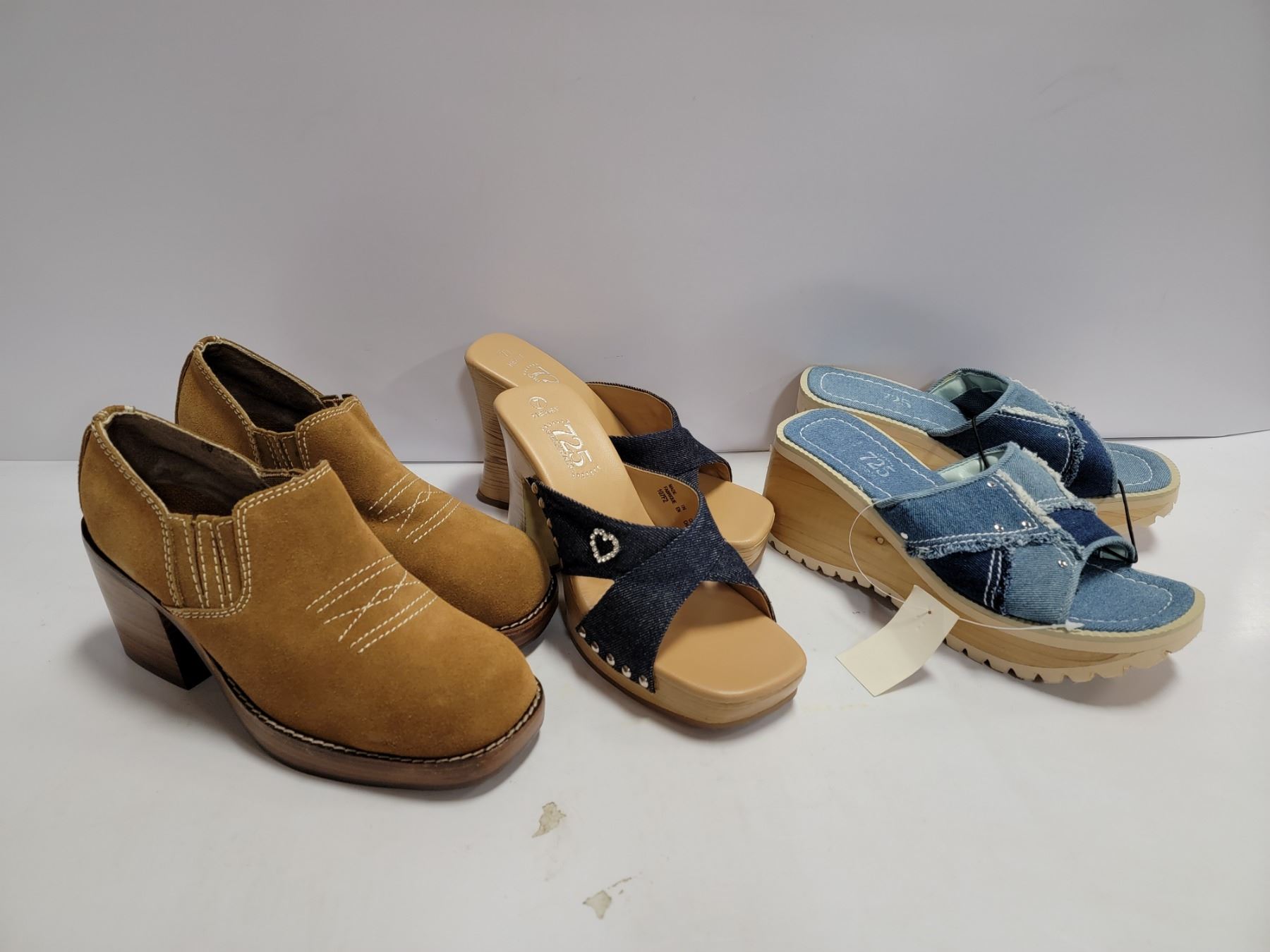INCLUDING A PAIR OF SIZE 7 DENIM FOOTWEAR, PAIR OF SIZE 7 DENIM HEART HEAL SHOES, AND SIZE 8 PAIR OF TAN LEATHER BOOTS