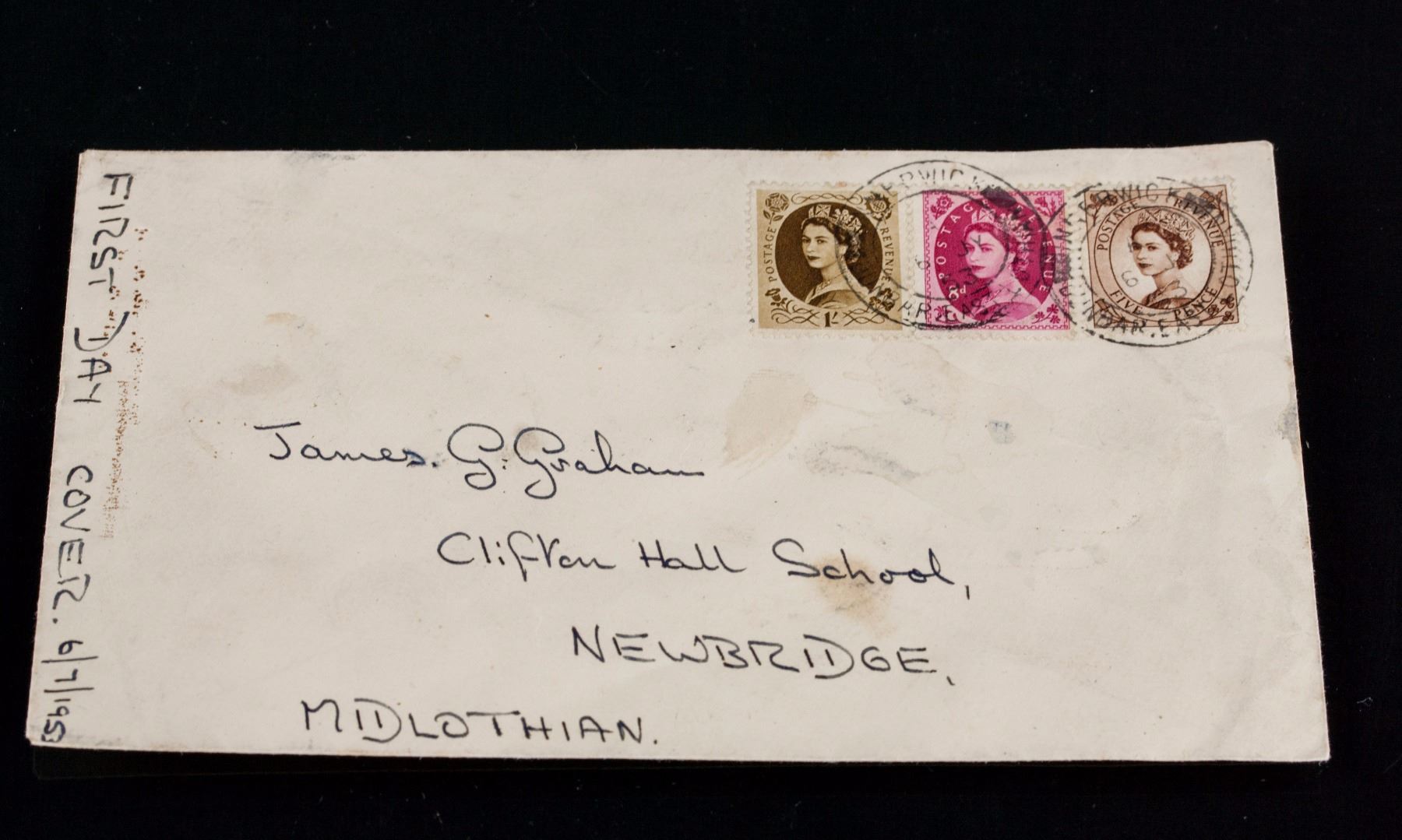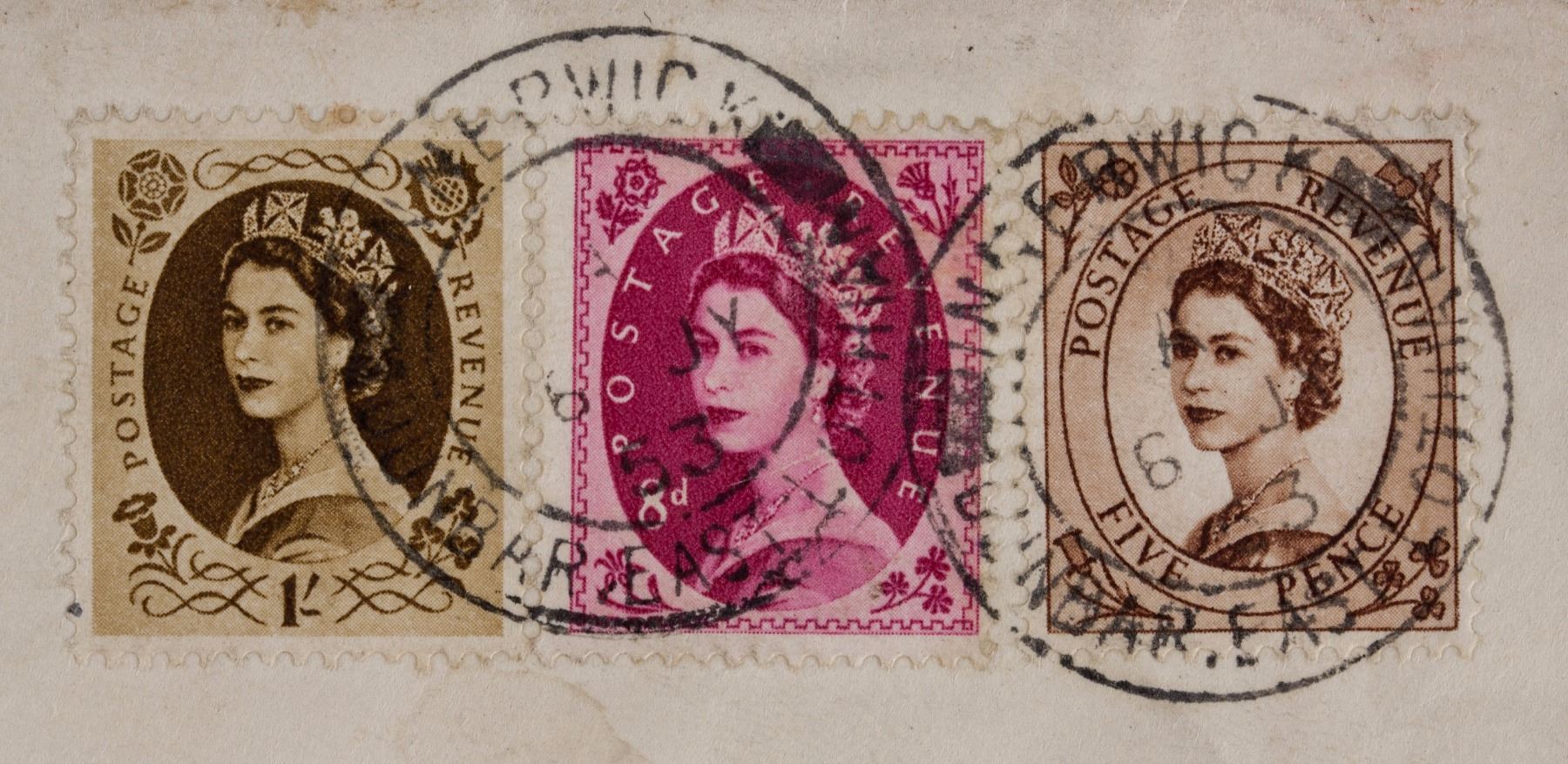 Three pieces of assorted United Kingdom stamp; one 1952 Queen Elizabeth II 1 pound stamp, SG529; one 1952 Queen Elizabeth II 8d stamp, SG525; one 1952 Queen Elizabeth II 5 pence stamp, SG522; with envelope; 9 cm x 15 cm