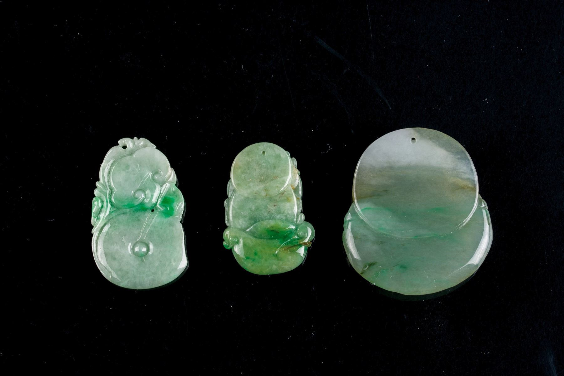 3 pieces of Burma green jadeite carved pendant; of one bird and ruyi form; one horse form; and one Happy Buddha form; pierced for suspension; 2 cm - 4.2 cm x 3.2 cm -3.5 cm, 44 grams(all), 3.38 (Buddha), 3.25 (Horse), 3.30 (Bird)