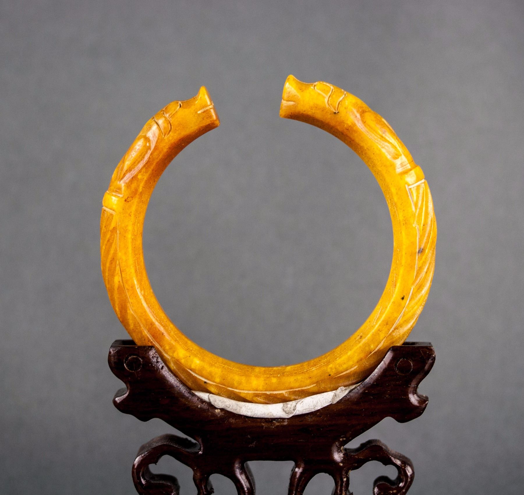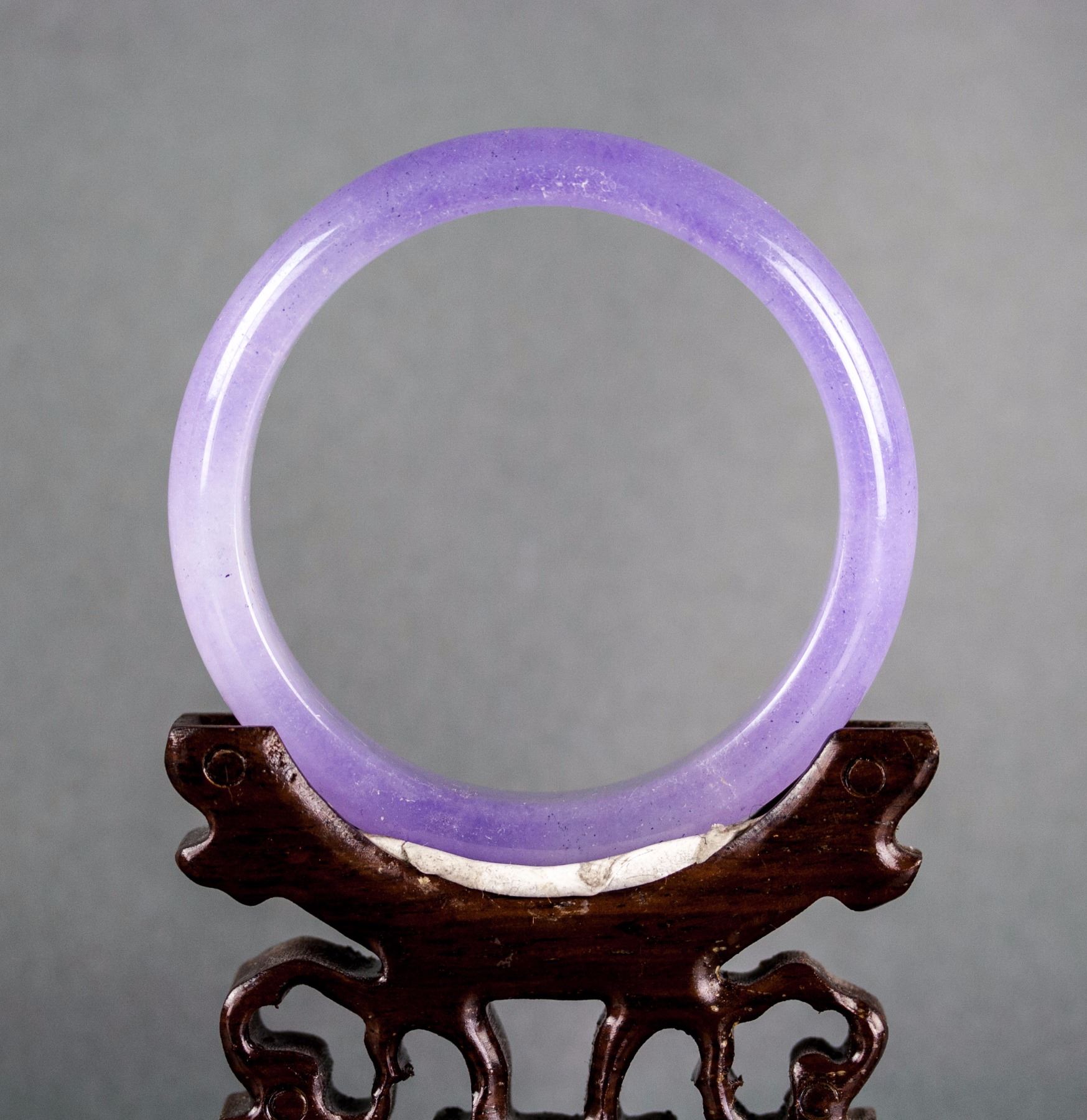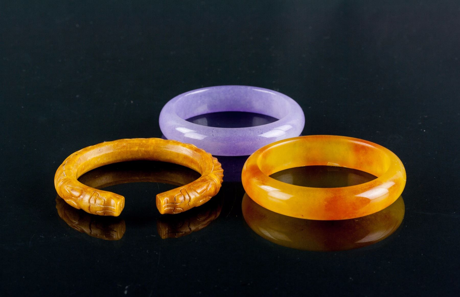 3 pieces of Chinese hardstone carved bangles; two of rounded outside and flatten inside; one of swirl pattern outside and flatten inside, carved with pig head ends; one of lavender tone; two of brown tone; D: 6 cm, 164 grams (3 pc)