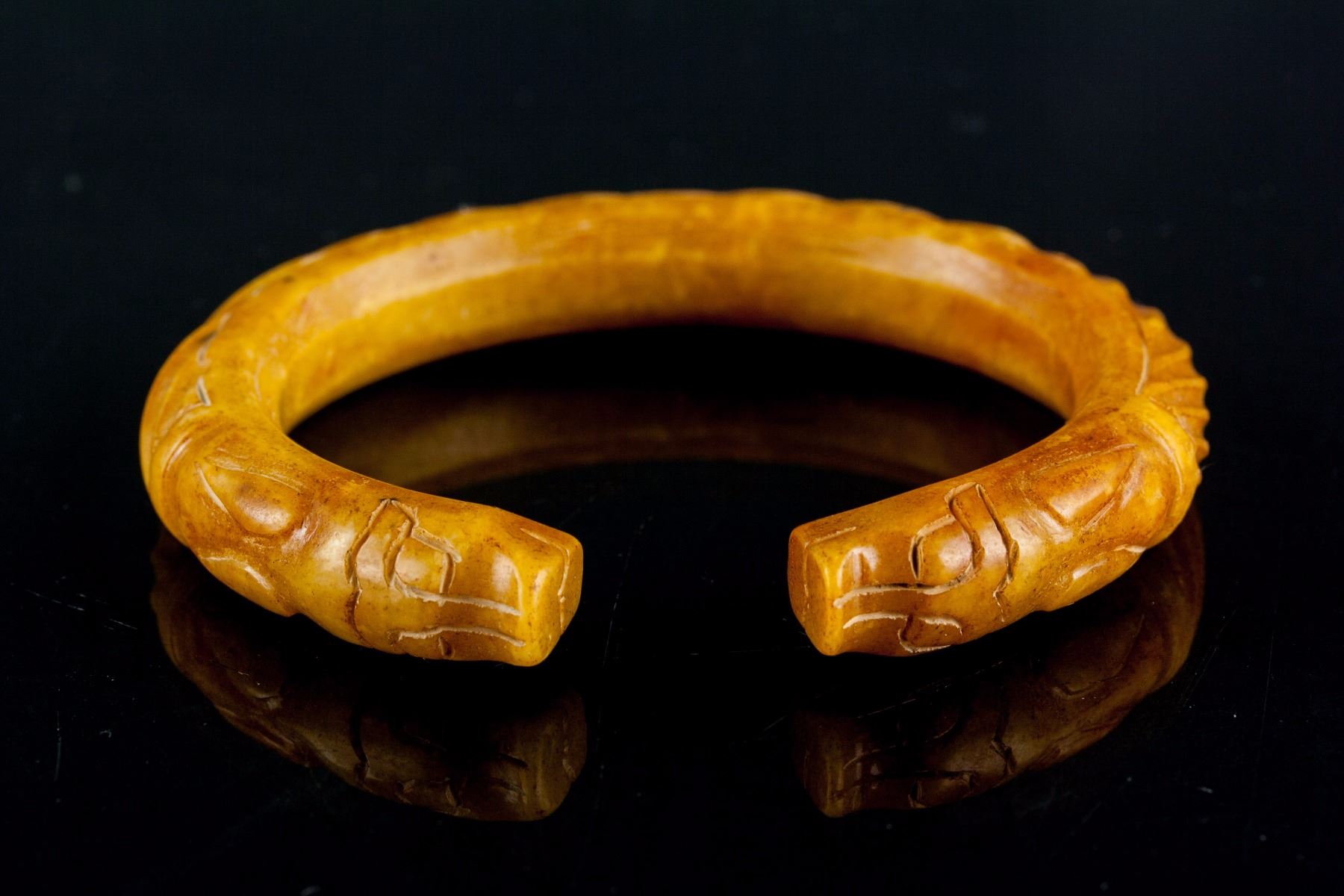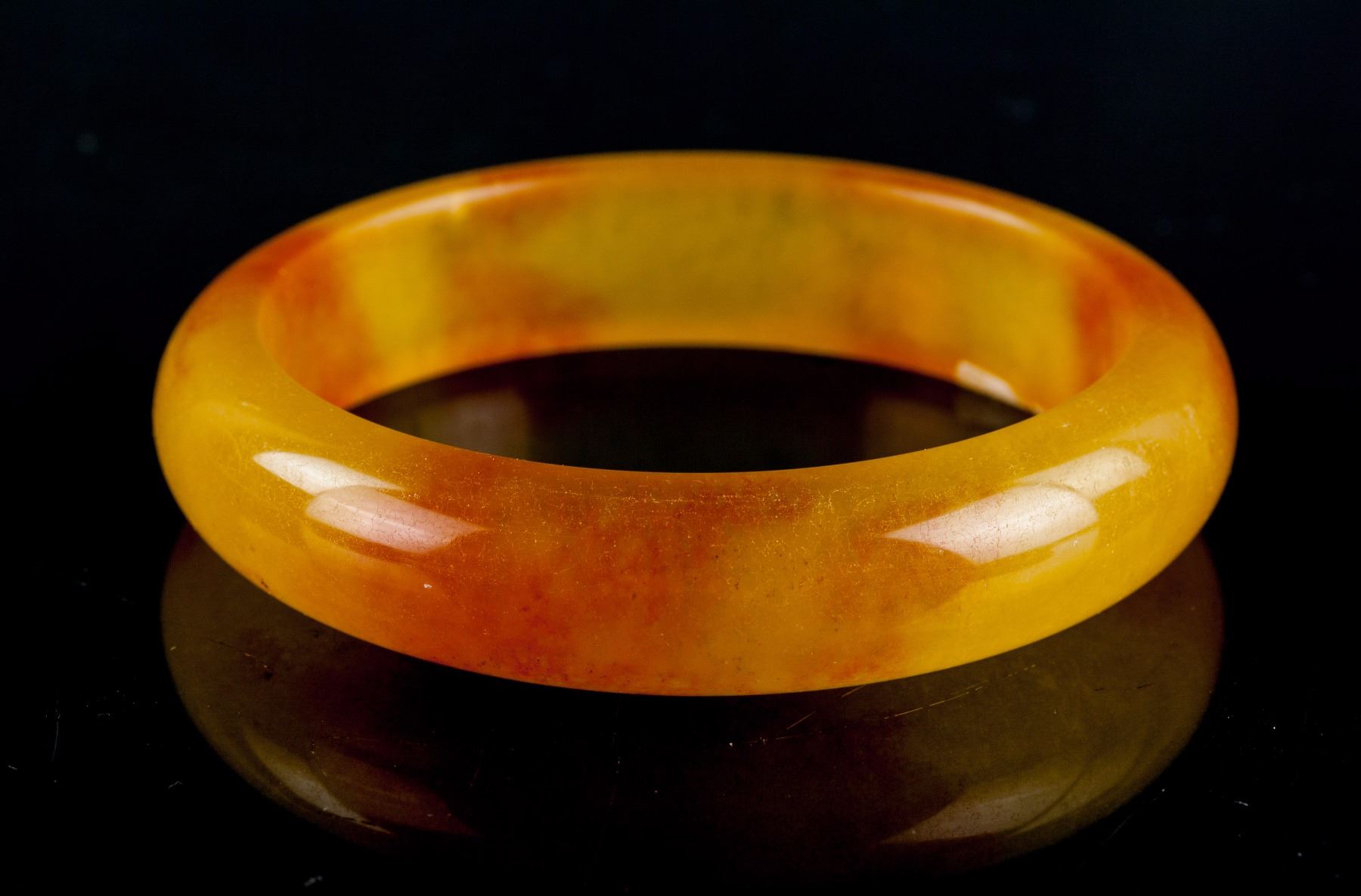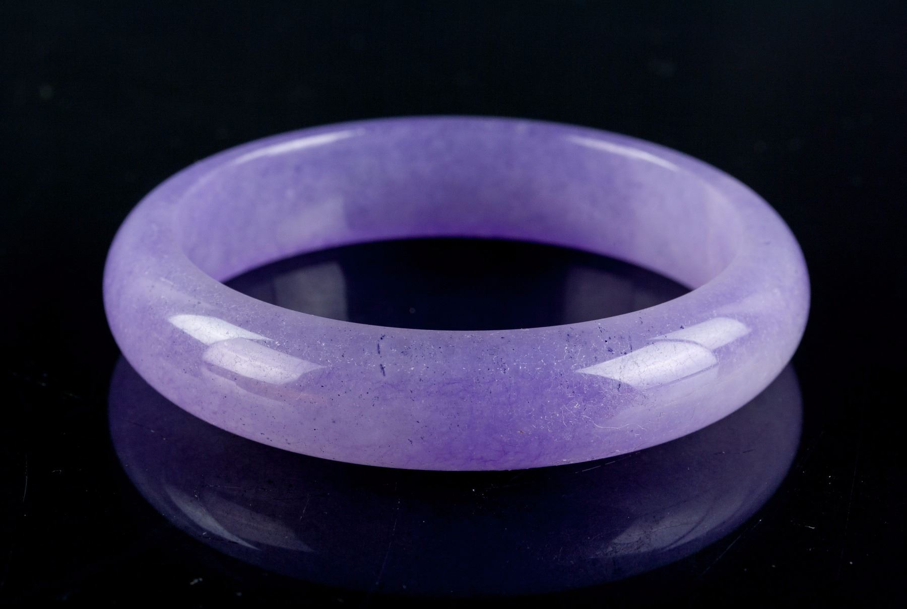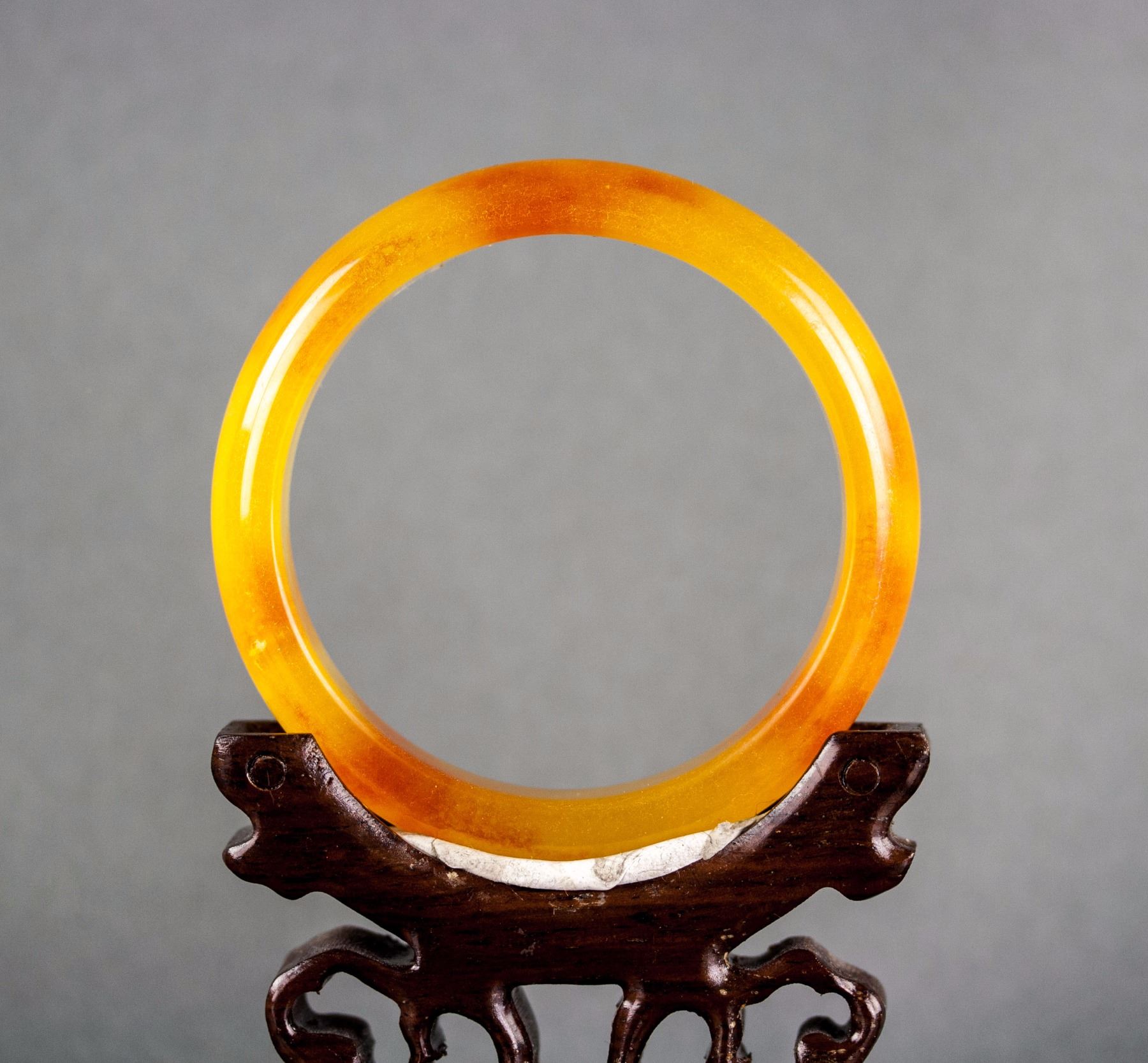3 pieces of Chinese hardstone carved bangles; two of rounded outside and flatten inside; one of swirl pattern outside and flatten inside, carved with pig head ends; one of lavender tone; two of brown tone; D: 6 cm, 164 grams (3 pc)