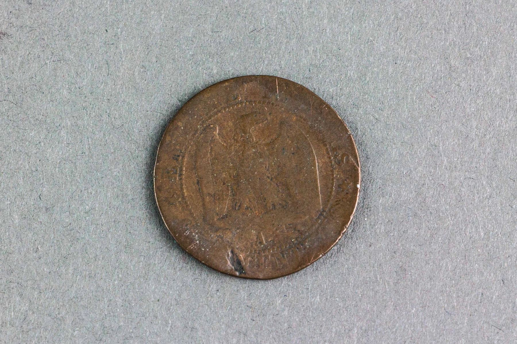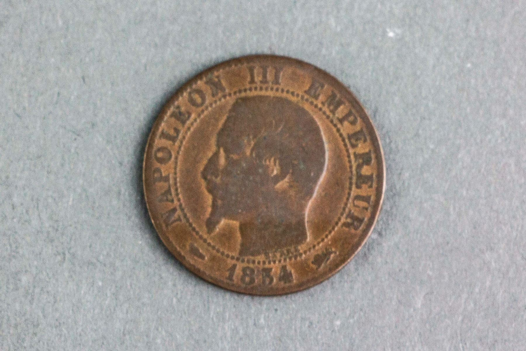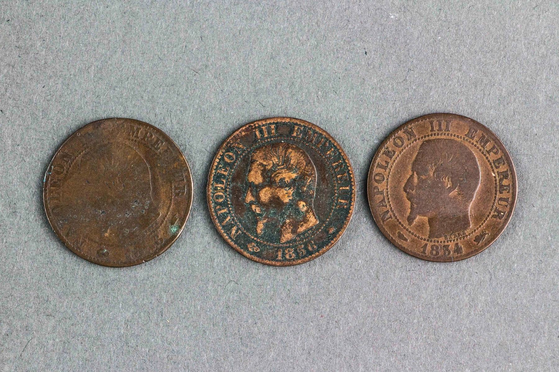 Three (3) France bronze coins; comprised of one 1834, one 1836 and one 1854 bronze coins; D: 2.5 cm, 14 grams (total)