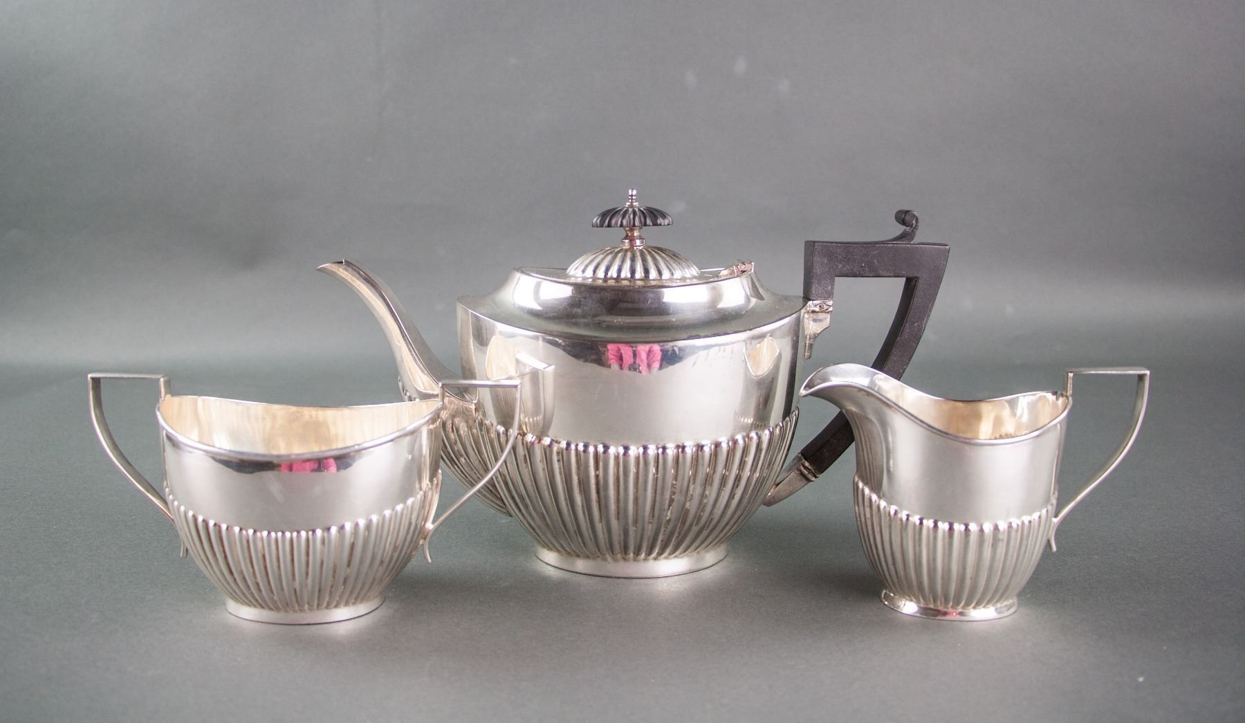 British 3 pieces silverware set; of 1 teapot, 1 cup and 1 pinch; with "R.M. E.P.N.S." mark and "Made in England" mark on base; 18 cm x 29 cm, 614 grams