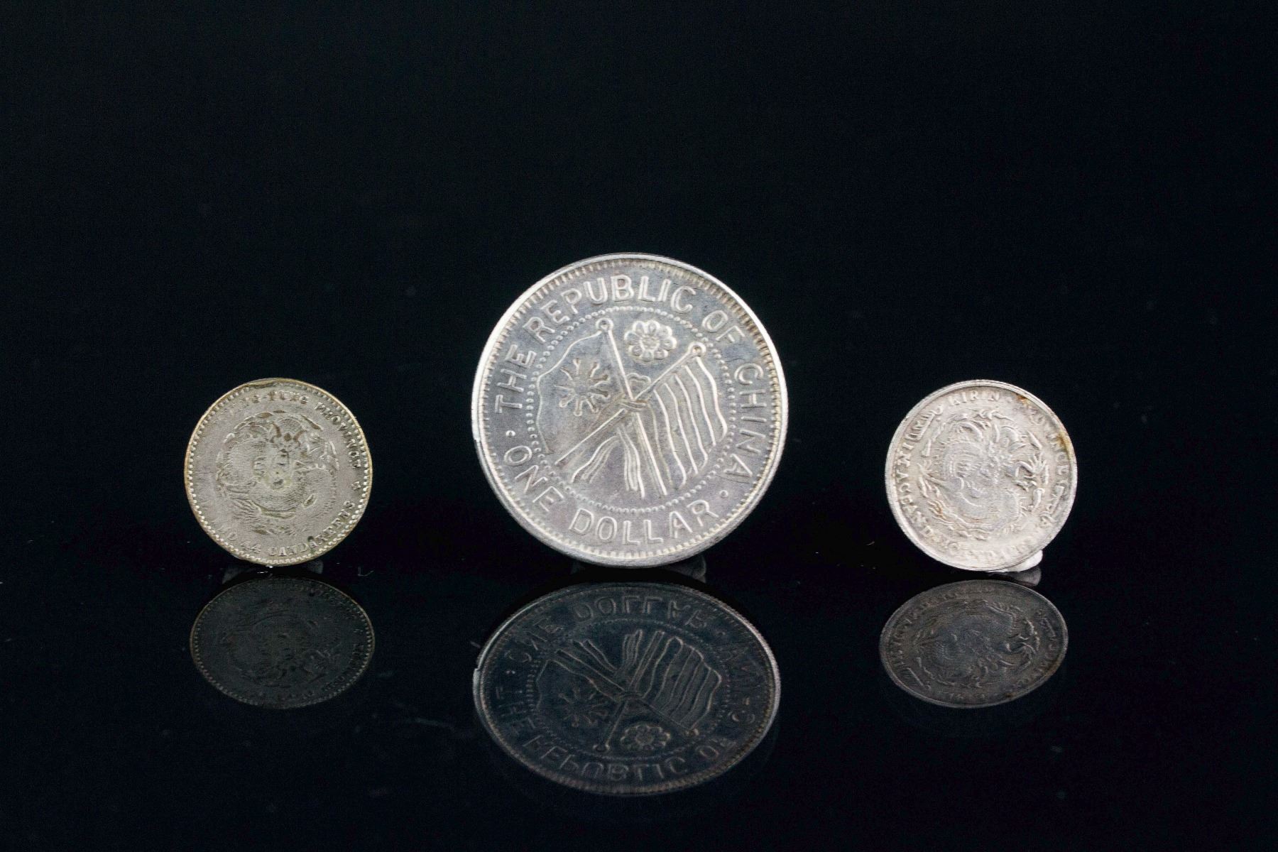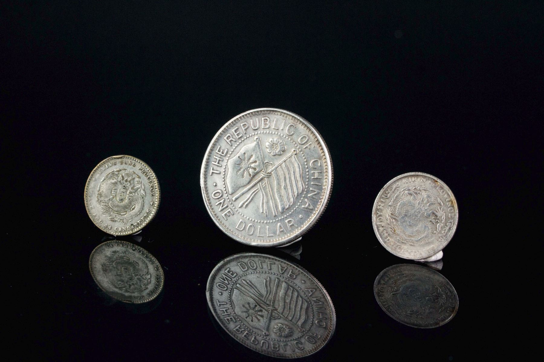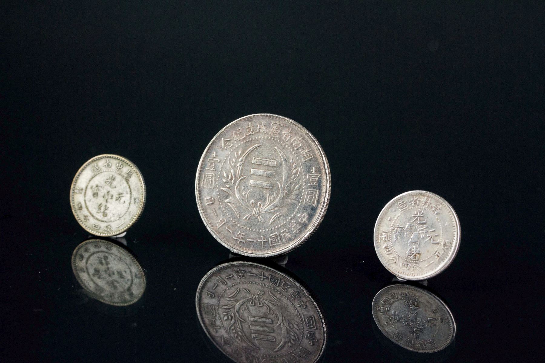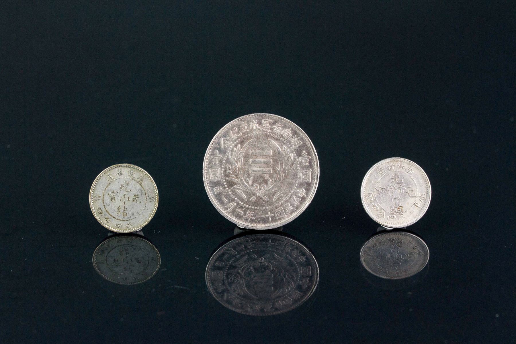 Three assorted Chinese silver coins; two of Guangxu Yuanbao; one of the Republic of China 1922 one dollar coin; Thickness: 0.1 cm - 0.2 cm, D: 2.4 cm - 3.9 cm, 28 grams (all)