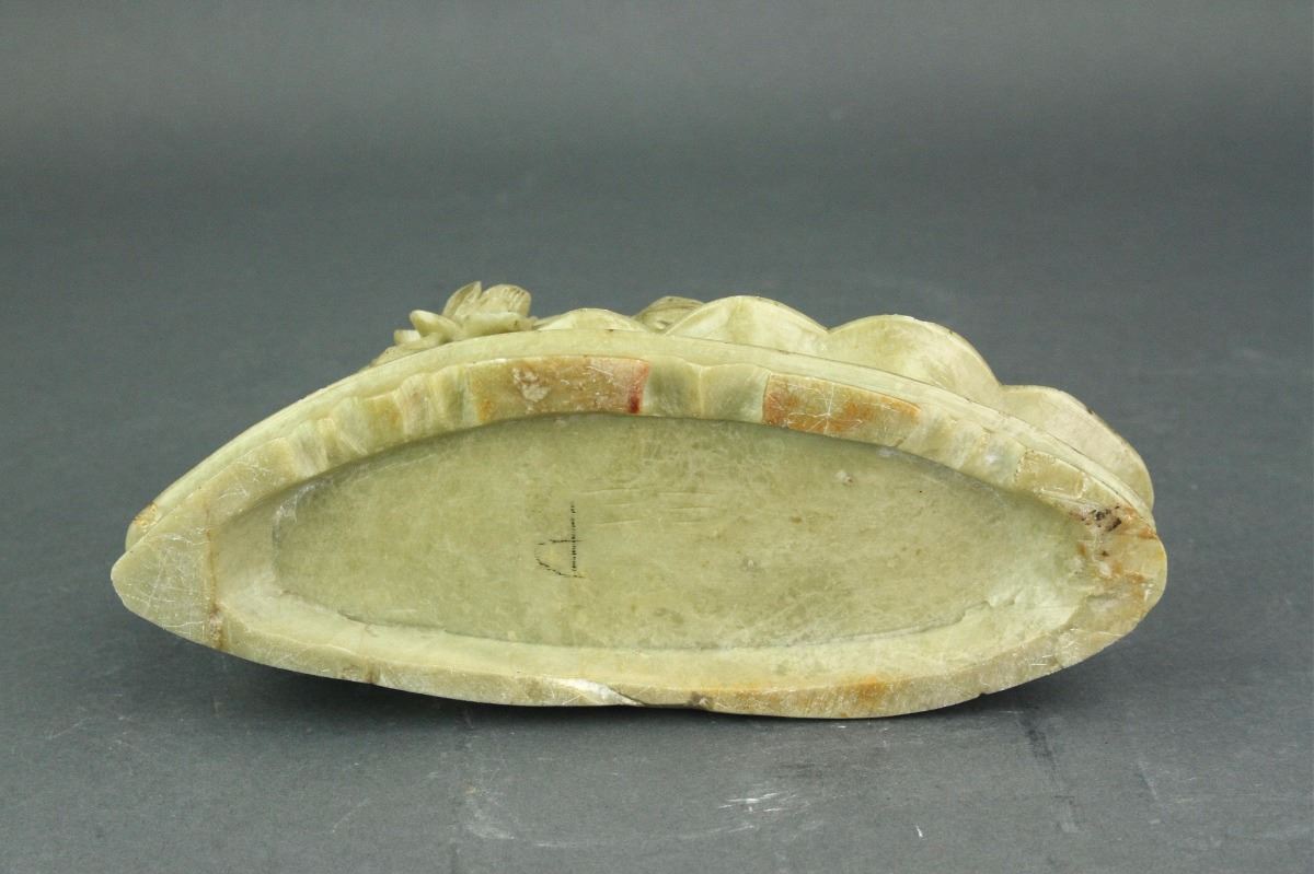 Three pieces of Chinese Shoushan celadon soapstone carved decorative items; comprised of one Fu dog statue, one rooster statue and one carved orchid waterpot; H: 14 cm, W: 10 cm, 584/596/901 grams