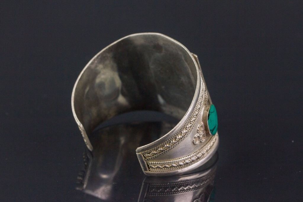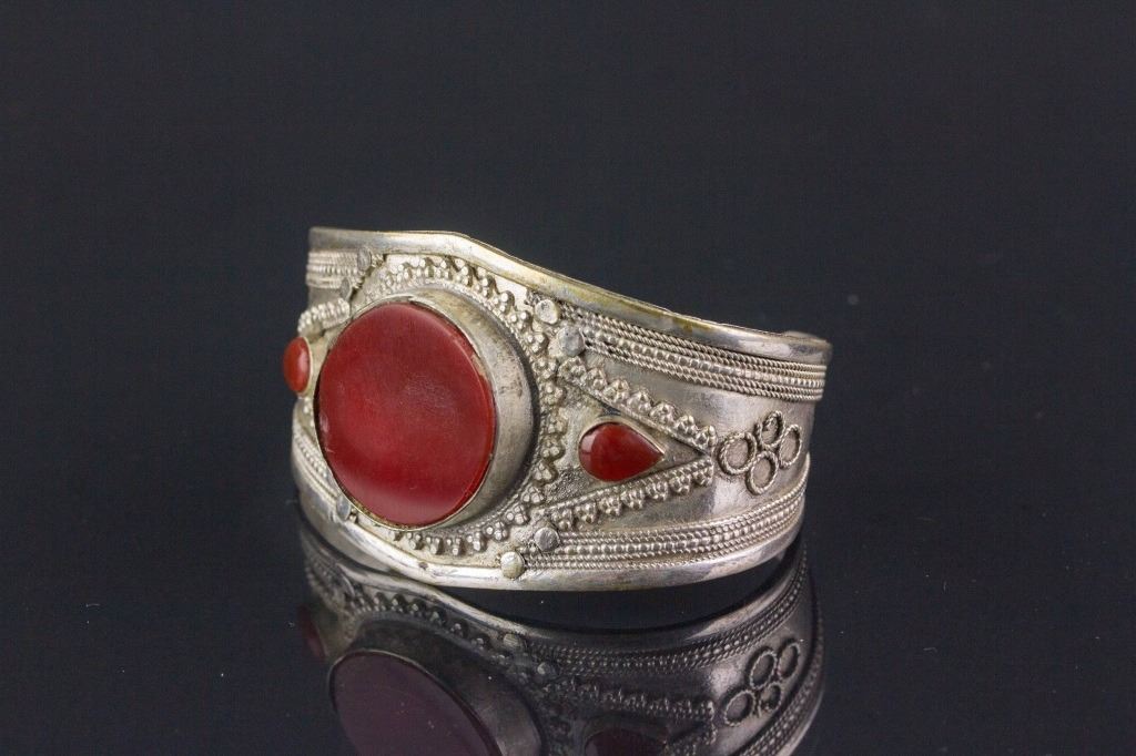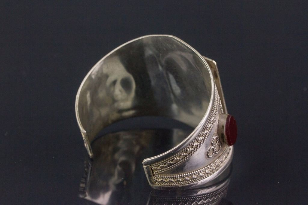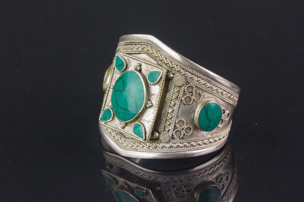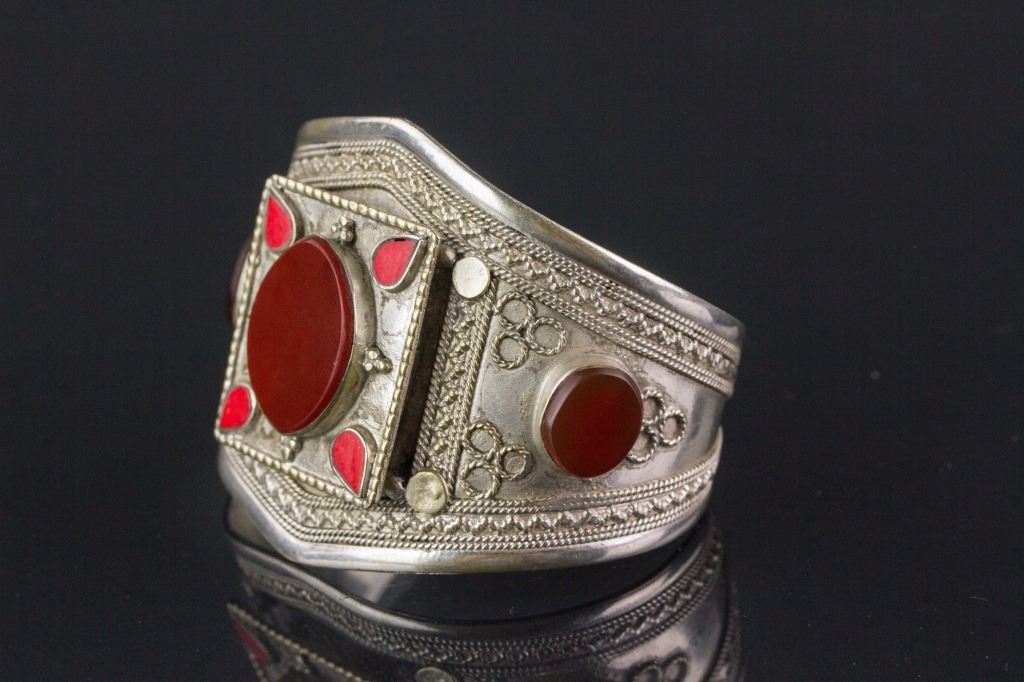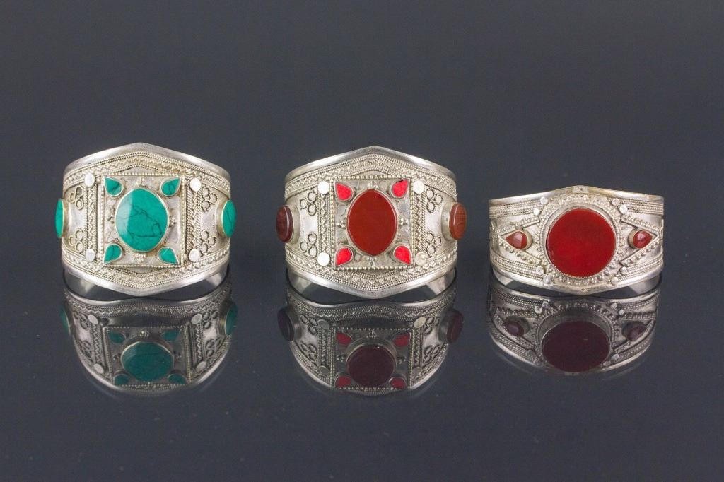 Three pieces of Chinese silver bracelet; one set with 6 varied shape turquoise, decorated with floral pattern carving; one set with 6 varied shape agate, decorated with floral pattern carving; one set with 3 varied shape agate, decorated with floral decoration; D: 6 cm, 131 grams