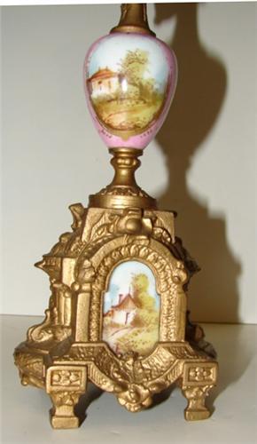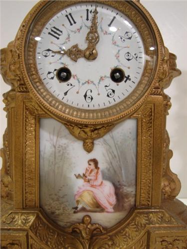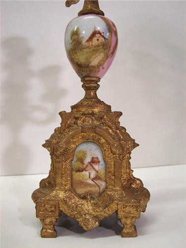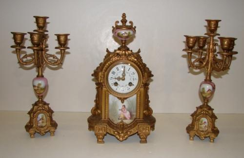 3 PIECE FRENCH PORCELAIN & GILT METAL GARNITURE SET. Consists of a mantel clock and two 5-lite candle holders. All are made of ornate gilt metal with hand painted porcelain decorations. Candle holders have a small hand painted porcelain scene with a cottage at bottom and ovoid hand painted porcelain stems decorated with a cottage scene. Clock is decorated at bottom with a hand painted porcelain scene depicting a seated female reading. Clock is decorated at top with a small circular porcelain finial decorated with a cottage scene. Clock works are marked “Made in France/Japy Freres”. Clock: 14” H, Candleholders: 13.25” H