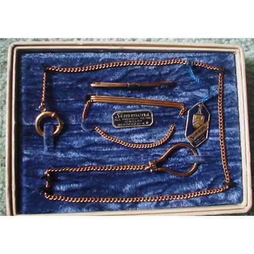 In the original box complete with tags. Do not miss the opportunity to own this Simmons All precious metal set of essentila mens Jewelry. Tests 14 KT gold with Patent mark of June 24, 1929.