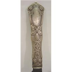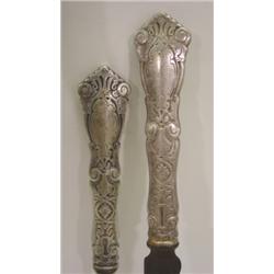 3 PIECE LOT OF STERLING SILVER UTENSILS consisting of one large carving knife (14" L), one small meat knife (8" L), and one small three-pronged fork (7" L). All are marked Sterling on handles. All are in need of cleaning. No monogram.