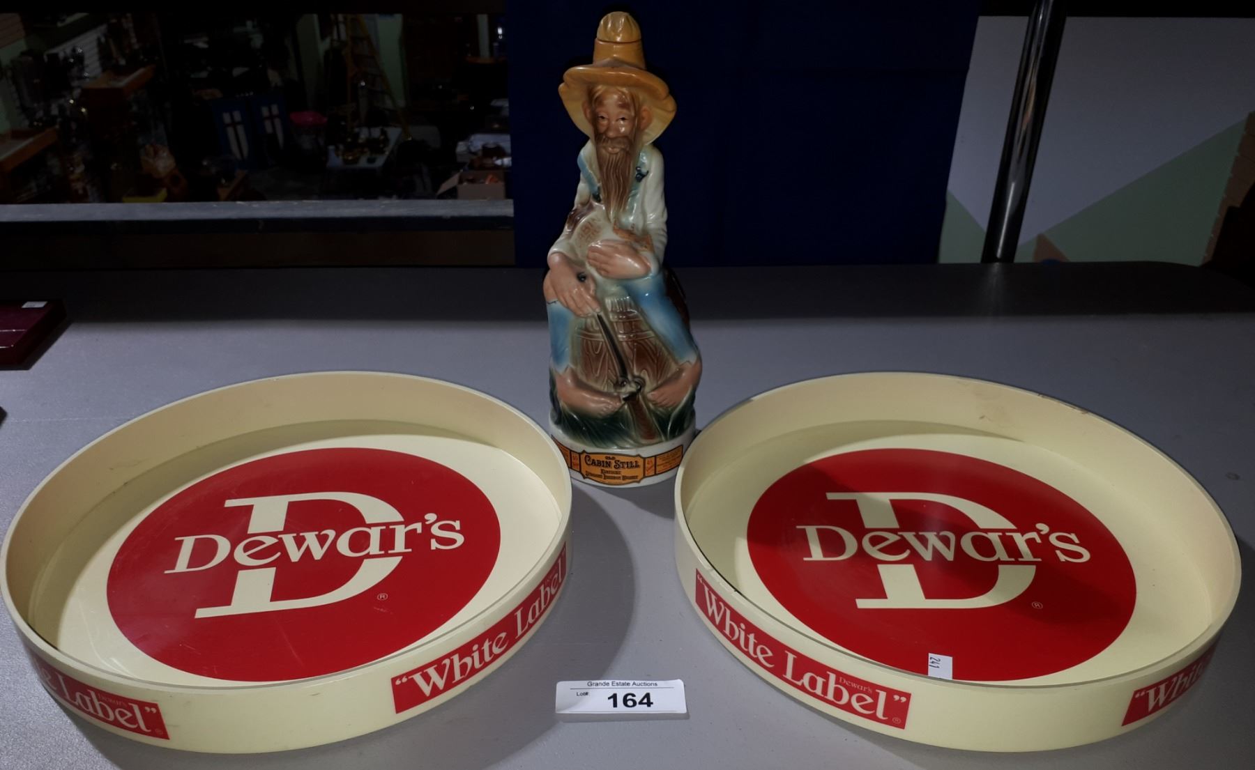 2 VINTAGE DEWAR'S SERVING TRAYS AND HILL BILLY WHISKEY DECANTER, APPROX 12.5" DIAMETER