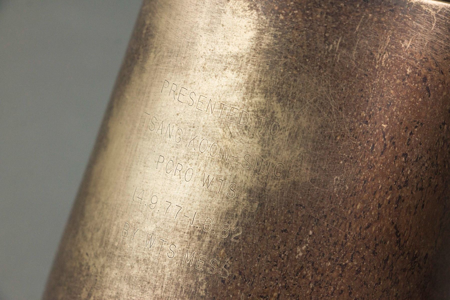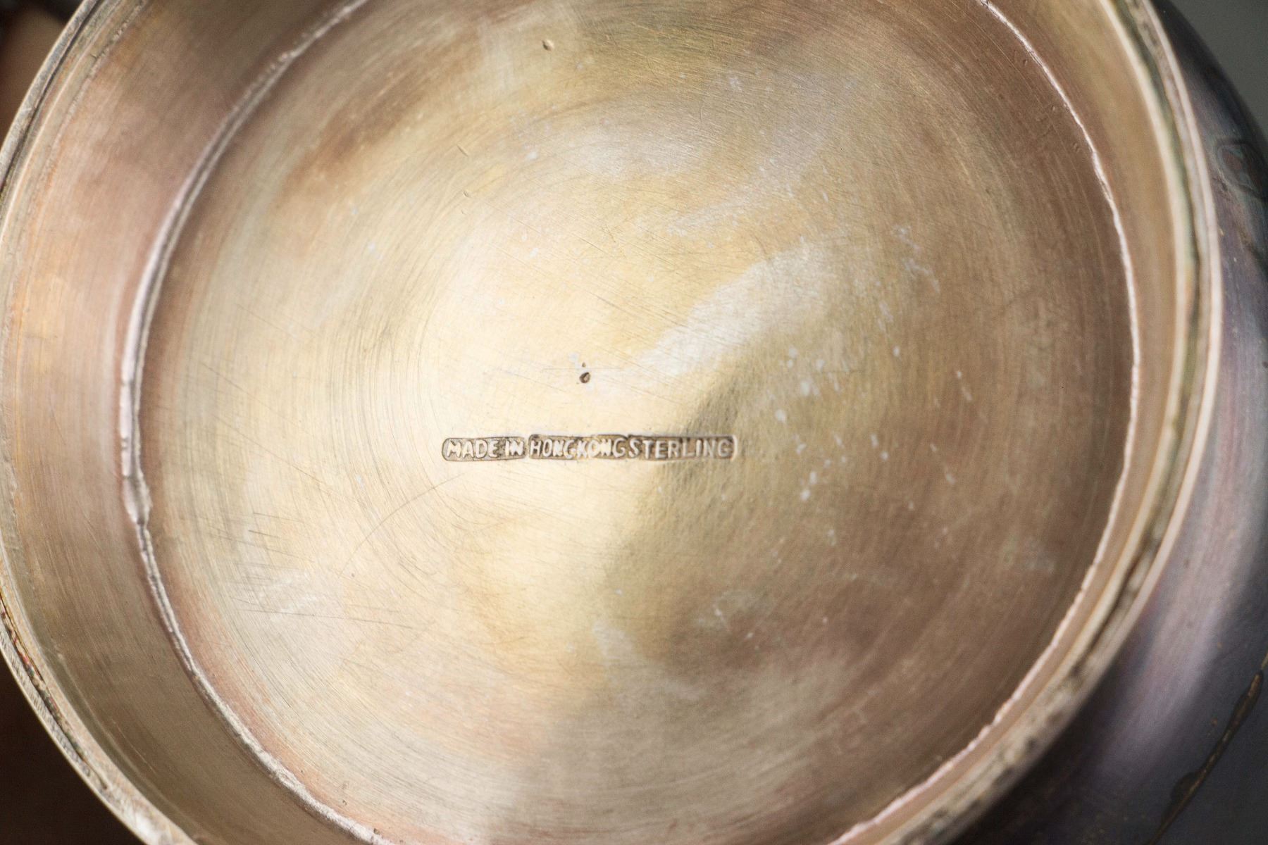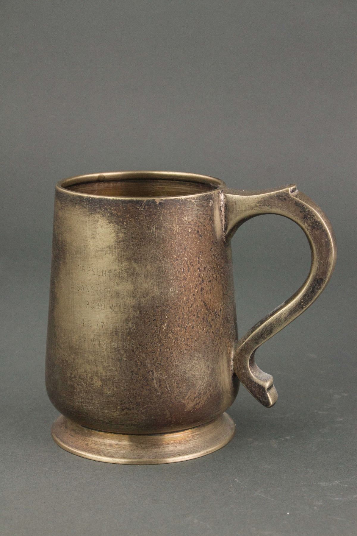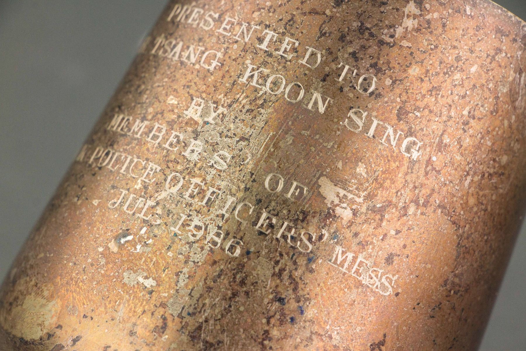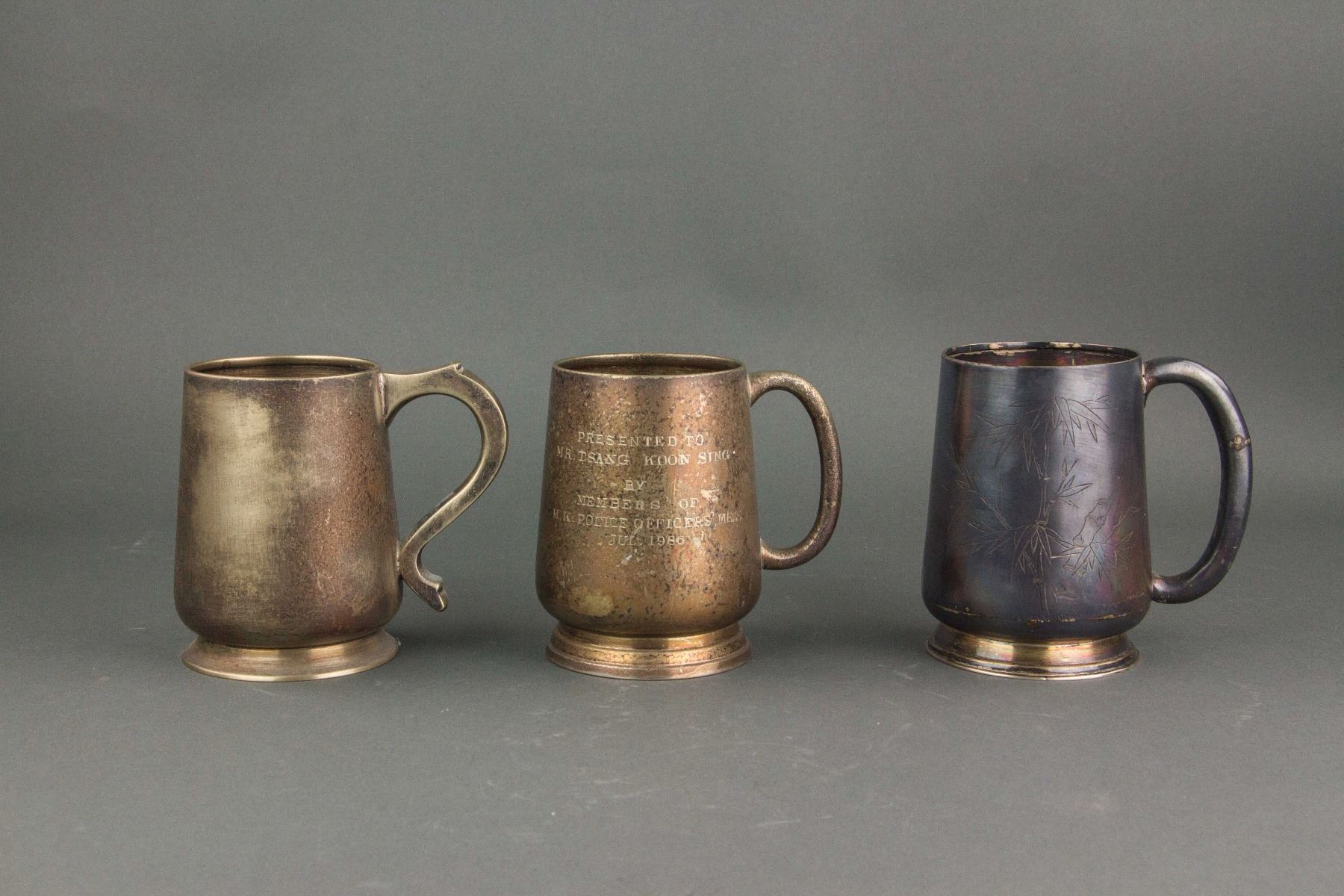 Three piece silver cups; with mark presented to Tsang Koon Sing, offered by M K Police Officers' Mess; one with Made in Hong Kong Sterling mark; H: 11-11.5 cm, W: 11-12 cm, 1050 grams total