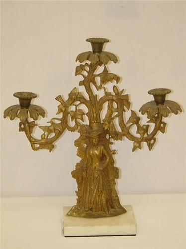 3 PC. VICTORIAN BRASS GRONDLE SET-LADY IN VICTORIAN DRESS & HAT W/ FRUIT & FLOWERS ON MARBLE BASE W/ CUT GLASS PRISMS (15 1/2") - CHIPS TO PRISMS, SOME MISSING