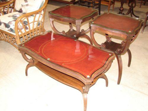 3 PIECE REGENCY STYLE TABLE SET. Consists of coffee table & 2 end tables with leather tops. Coffee table: 18.5” H, 40” W, 22” D. End tables: 28” H, 21.25” x 21.25”