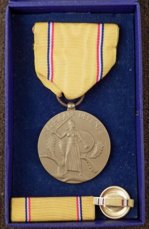 THIS IS A THREE PIECE WWII AMERICAN DEFENSE SERVICE & CAMPAIGN MEDAL, 1939-1941. IT COMES WITH MEDAL RIBBON BAR & LAPEL BAR IN ITS ORIGINAL BOXED. THIS A GREAT LOOKING ORIGINAL PRISTINE SET OF 3. *