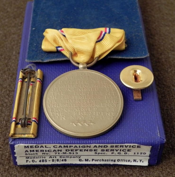THIS IS A THREE PIECE WWII AMERICAN DEFENSE SERVICE & CAMPAIGN MEDAL, 1939-1941. IT COMES WITH MEDAL RIBBON BAR & LAPEL BAR IN ITS ORIGINAL BOXED. THIS A GREAT LOOKING ORIGINAL PRISTINE SET OF 3. *