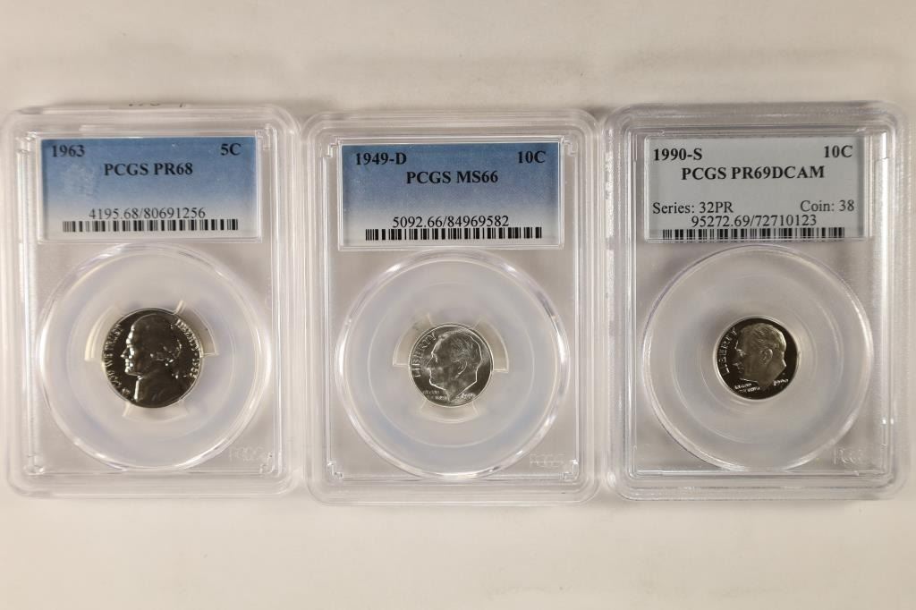 PR68, 1949-D ROOSEVELT DIME MS66 AND 1990-S ROOSEVELT DIME PR69 DCAM
