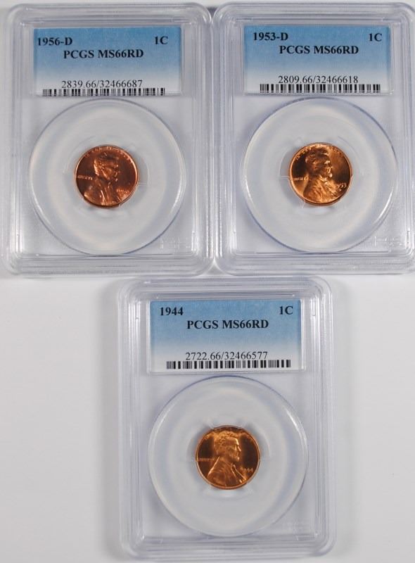 3 - PCGS GRADED LINCOLN CENTS, PCGS MS-66 RED: 1944, 1953-D & 1956-D