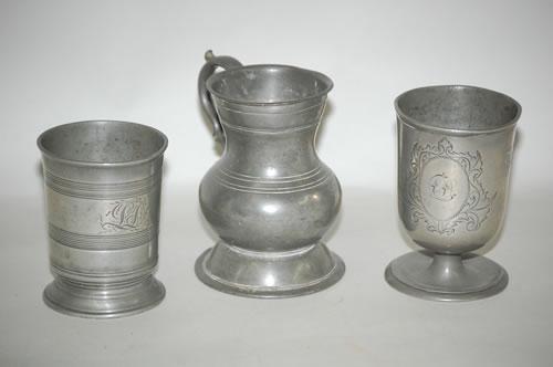 (3) PCS. 19TH CENT. ENGLISH PEWTER: (1) PEWTER 1/2 PINT HANDLED MUG W/ ENGLISH HALLMARK & (2) ENGLISH FOOTED 1/2 PINT BEAKERS W/ ENGRAVED MONOGRAMS (VARIOUS SIZES NEAR 4 1/2" T) - WEAR, IMPERFECTIONS