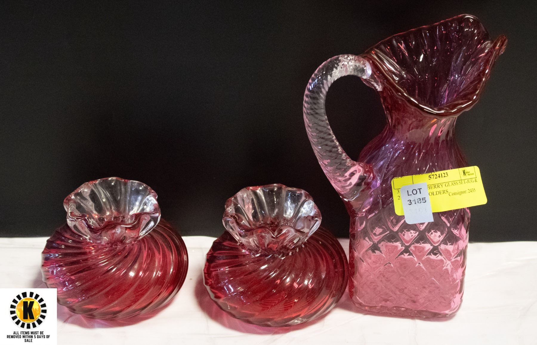 3 PCS CRANBERRY GLASS SET-JUG & 2 CANDLE HOLDERS