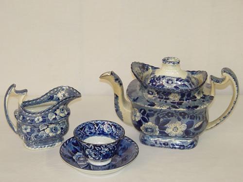 (3) PCS. OF BLUE & WHITE STAFFORDSHIRE HOLLOW WARE IN FLORAL PATTERNS W/ STIPPLED BACKGROUNDS: (1) SQUATTY TEAPOT W/ LID, (1) CREAMER, & (1) CUP & SAUCER - 2 1/4" HAIRLINE IN TEAPOT, TINY LID CHIPS, EDGE WEAR, STAINS, IMPERFECTIONS